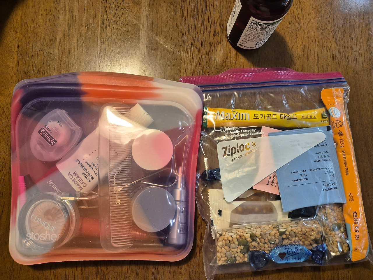 간단한 간식류와 썬스크린, 치실, 속옷류와 티셔츠 두 장으로 준비는 끝이다.차 트렁크에는 그늘막이와 돗자리가 늘 있으니 바다만 필요한 것!