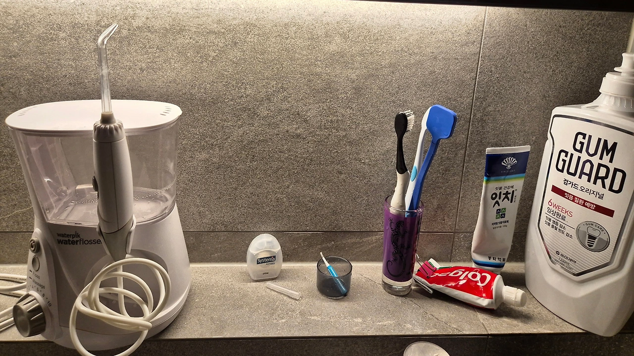 예를 들면 욕실에서 쓰는 다양한 구강 세척 도구들은 이동이 가능한 것들은 사용후에는 선반 안으로 보이지 않게 넣어두도록 하는 것도 정리의 기술이다.