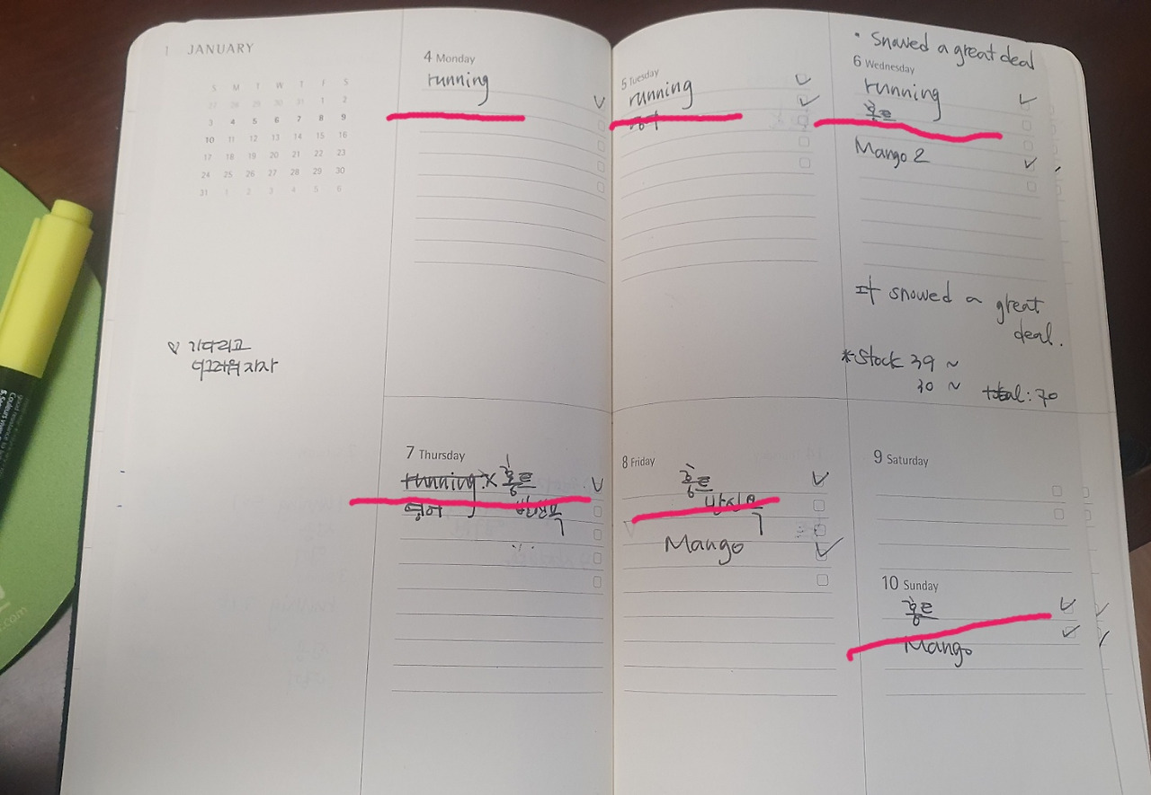 1. 달리기를 한 날에는 "running"이라고 달린 거리를 다이어리에 표기했다.