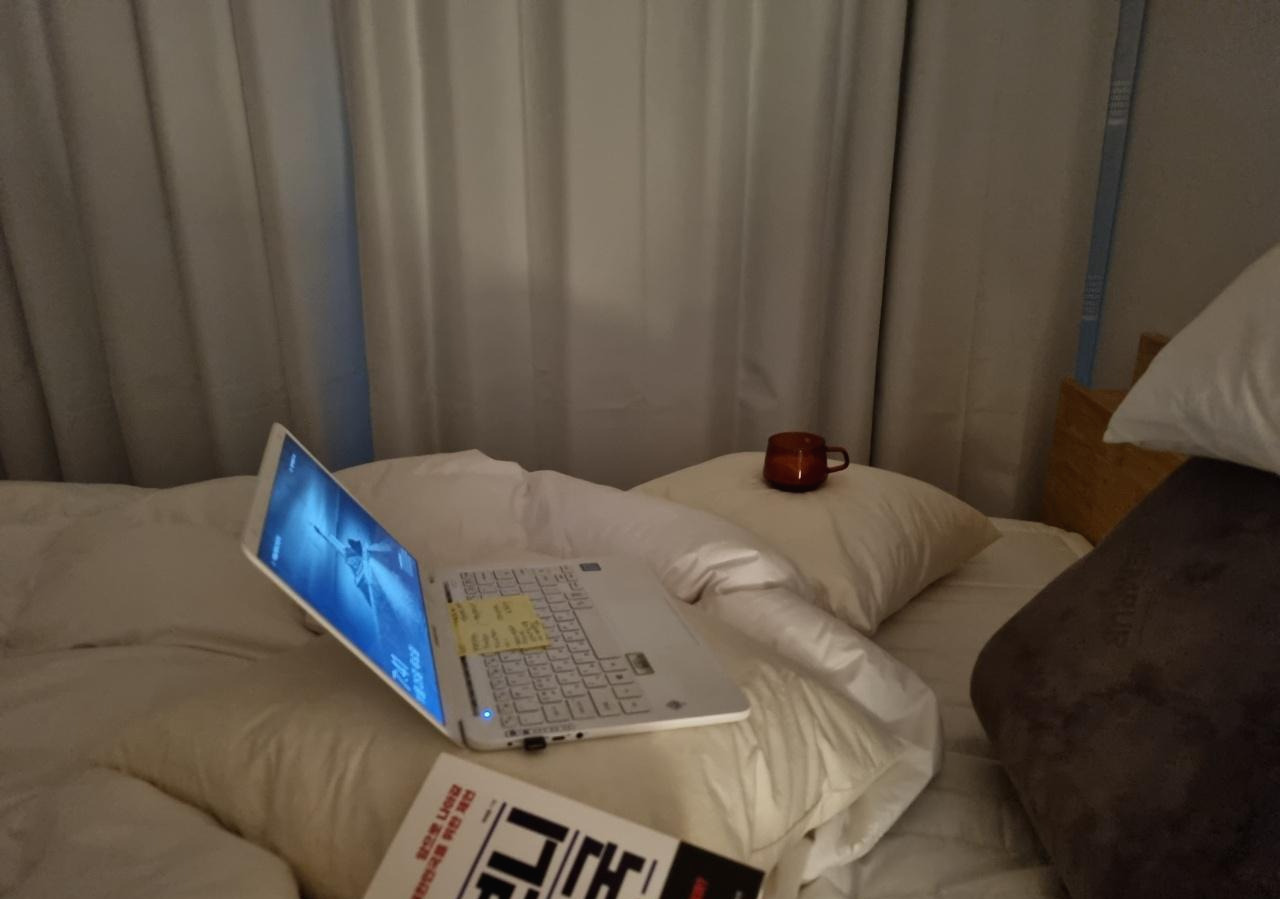 @ 8시간 반을 자고 아침에 침대에서 노트북을 꺼냈다