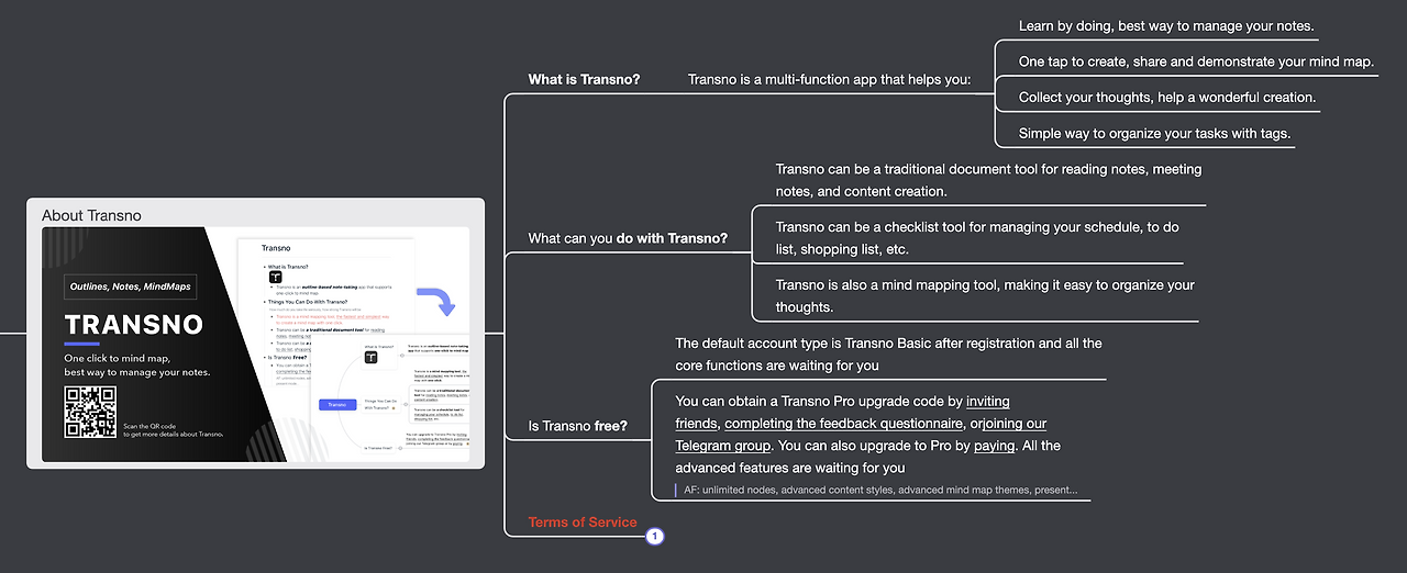 Transno는 텍스트 에디터와 마인드맵의 조합을 통해 생각을 정리하며 글을 쓰는 새로운 방법을 탄생시켰습니다. 글을 쓸 때 더 이상 빈 화면 앞에서 막막해하지 않아도 괜찮습니다. 마인드맵을 통해 생각을 정리하다 보면 멋진 글이 탄생할 것이니까요.
