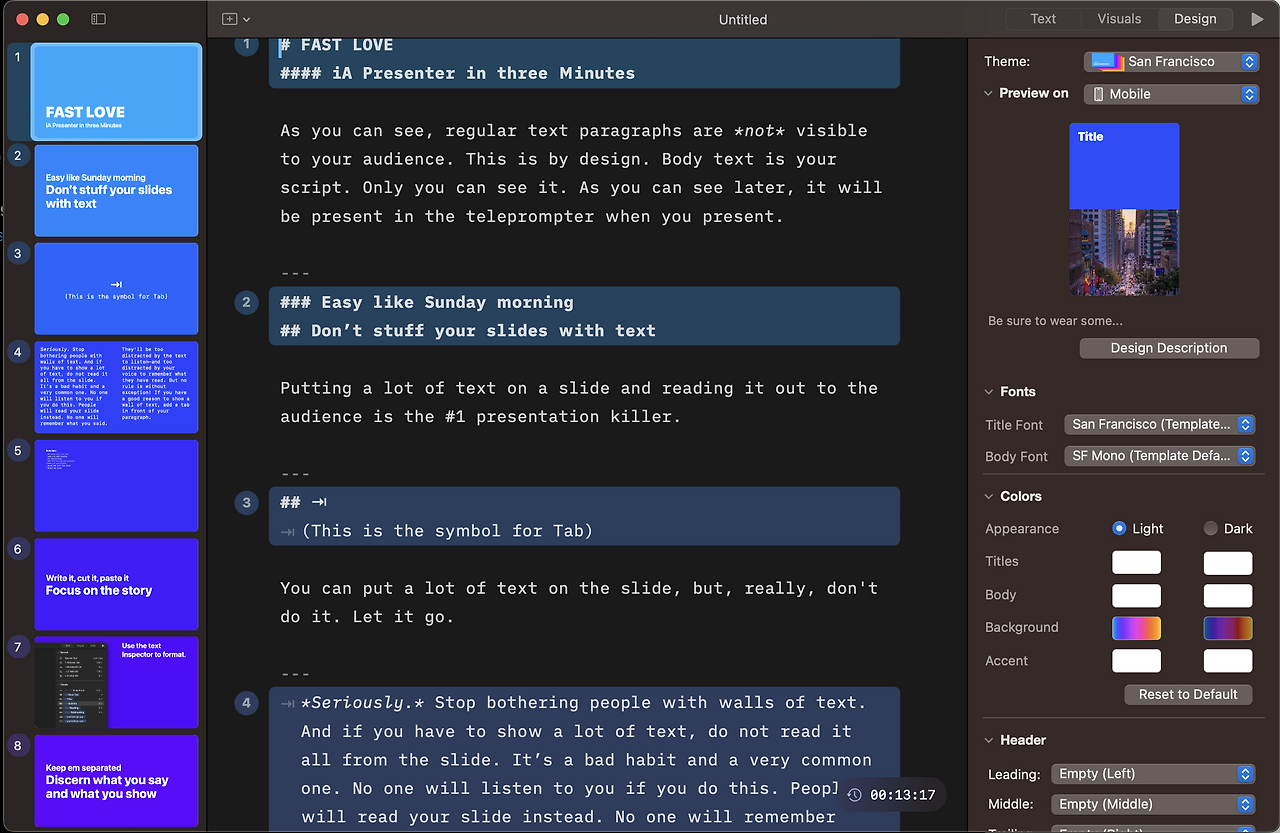 이렇듯 개발자와 디자이너, 서로 각자의 영역에서만 사용하던 두 가지의 아이디어가 만나 iA Presenter라는 훌륭한 프로덕트가 탄생하였습니다. 아직 베타 테스팅 단계의 macOS 전용 앱이지만 이미 충분히 제품의 가능성을 입증해내었습니다.