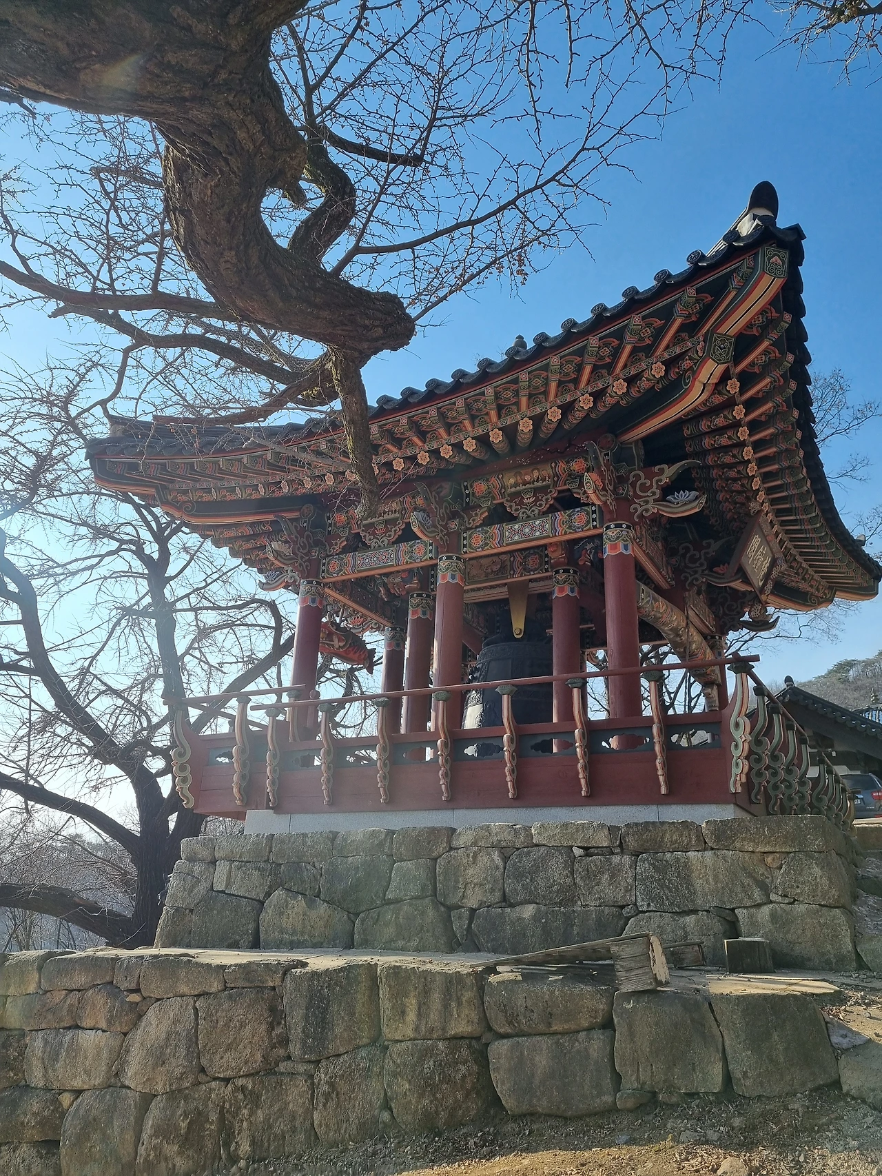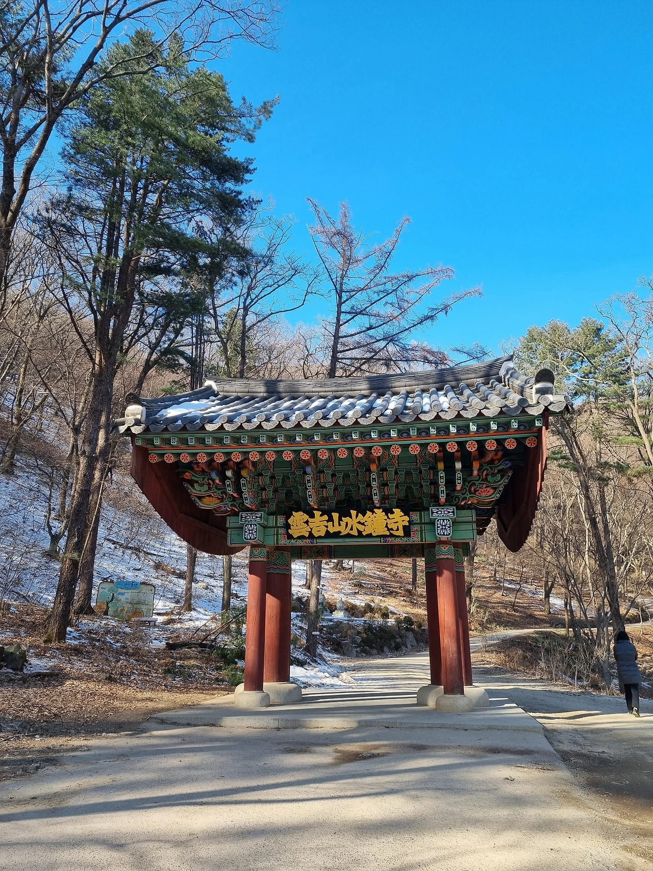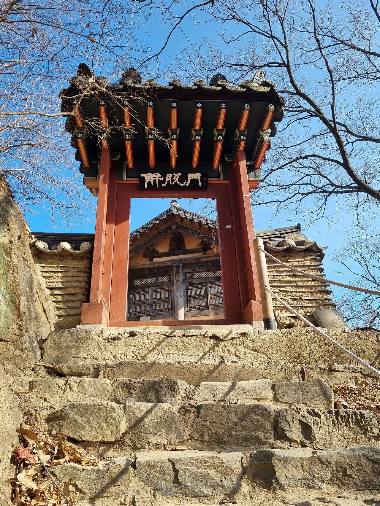 명상의 길로 걷다 보면 불가의 세계로 들어가는 불이문을 나온다. 불이문을 지나 가파른 돌계단을 한 발 두발 딛다가 고개 들면 눈앞에 해탈문이 나타난다. 그 문을 통과해야만 사찰의 모습이 드러난다. 물의 정원 뱃나들이교에서 아득하게만 보였던 절에 드디어 도착한 것이다.