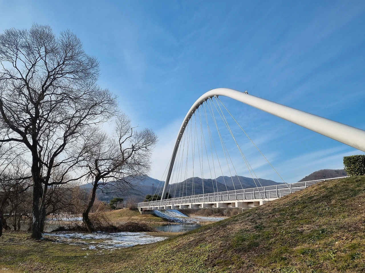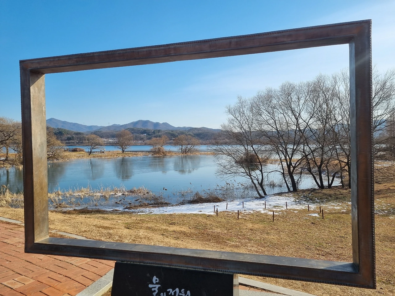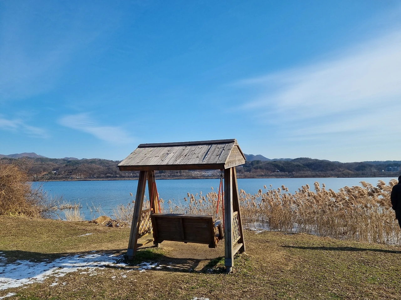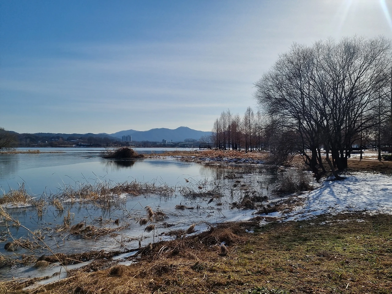 물의 정원을 상징하는 뱃나들이교를 건너 강변 따라 산책을 하는데 초록도 없고 밝은 빛깔의 꽃도 없지만 없으면 없는 대로 좋았다. 그저 텅 빈 공간에 매서운 바람만 가득했어도. 북한강 위로 부서지는 햇살에 물살이 비늘처럼 빛이 났고 무채색의 풍경위에 드러난 하늘은 하염없이 파랬다.