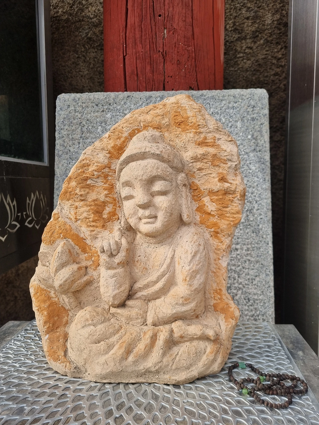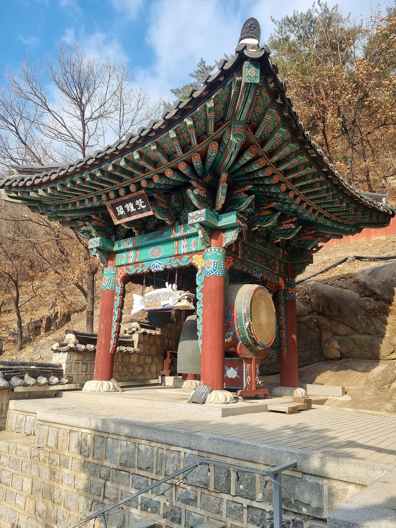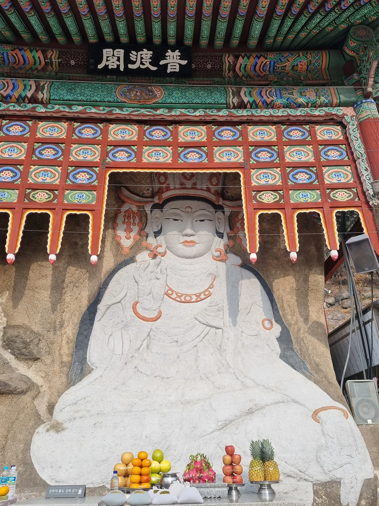우리가 찾아간 곳은 계단 없이 평평한 데크로만 조성된 둘레길이었는데 걷는 게 좀 불편한 사람도 너끈히 다녀올 수 있는 곳이었다. 큰길에서 멀찍이 홍지문이 보였고 내부순환로 아래쪽으로는 홍제천이 흐르고 있었다. 한눈에 들어온 것은 다름아닌 옥천암 마애보살좌상이었다. 보관을 쓰고 감긴듯한 눈매와 호분이 칠해져 마치 옅은 화장을 한 여인네처럼 보였는데 그래서인지 백불이라고 부른다고 한다. 바위자체는 10m이고 마애불의 높이는 그 절반인 5m의 높이. 위에서 우리를 내려다보는 불상 앞에서 어쩔수 없이 합장만 한다. 공양하고 절을 하려는 사람들이 줄을 서 있었기 때문에 이 정도로 예를 갖추고 우리는 데크 쪽으로 이동했다.