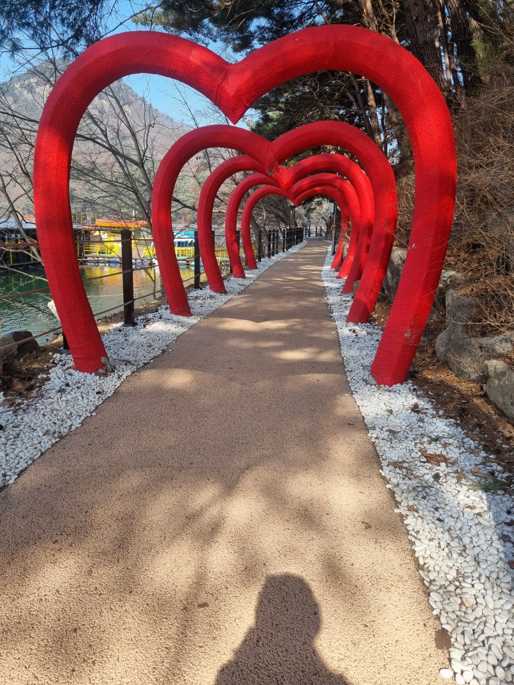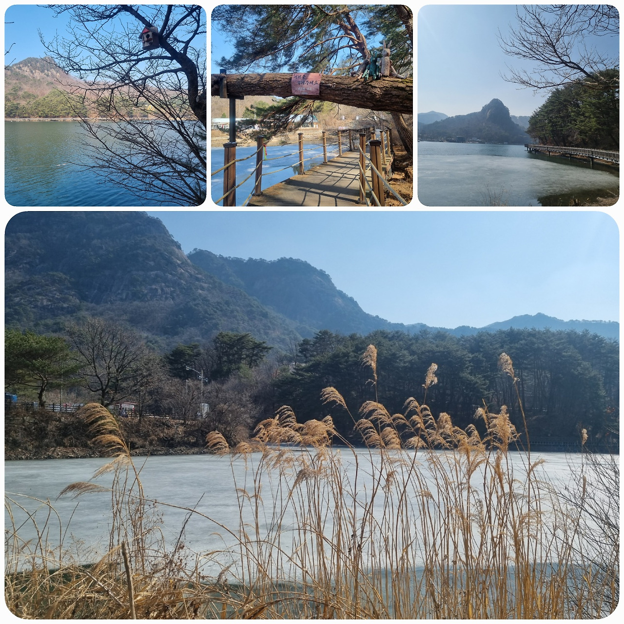 다음날 아침, 햇살이 눈부셨다. 산책하기 좋은 날씨였다. 늘 걷는 사람에게 3.2 km 둘레길은 누워서 떡먹기다. 궁예코스길, 소나무가 우거진 길, 조각공원, 수변데크길로 이어졌는데 웬 궁예 했더니, 궁예가 명성산(울음산)에 들어와 생을 마감했단다. 명성산 궁예이야기는 몰라도 가을 억새밭은 유명해서 알고 있었는데, 듬성듬성 바위가 박힌 저 산 어디에 억새밭이 있다는 건지 도무지 알 수가 없었다.