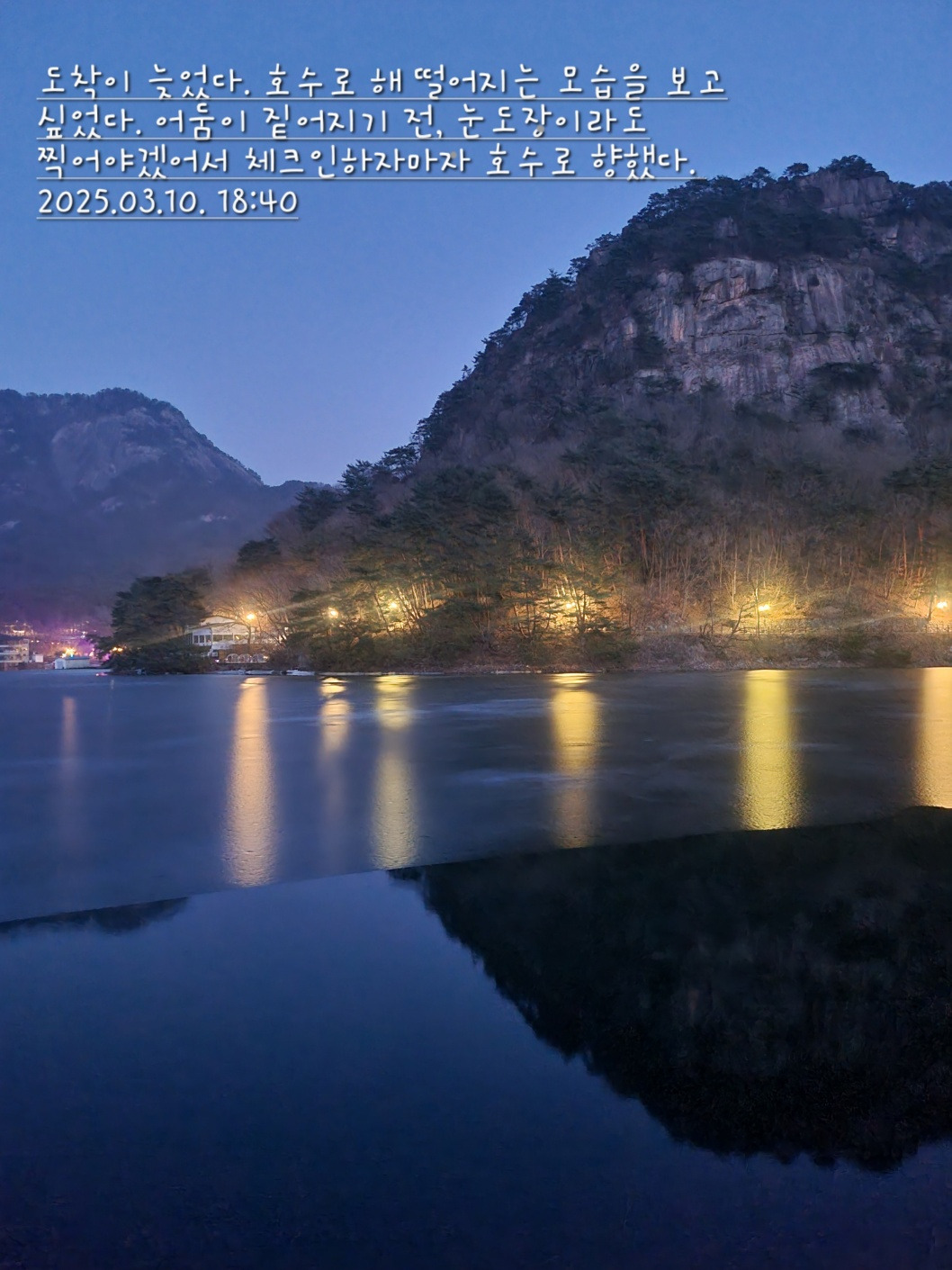 강원도 고성에서는 잠시, 볼일 마치고 곧장 경기도 포천으로 향했다. 짧은 거리가 아니어서 예상보다 늦게 도착했다. 산정호수에서 해 떨어지는 모습을 바라보고 싶었지만 어쩔 수 없었다. 숙소에 짐을 넣어두고 곧바로 산길 따라 호수로 올라갔다. 어둠에 묻히기 전에 눈에 넣어두고 싶었기 때문이다.