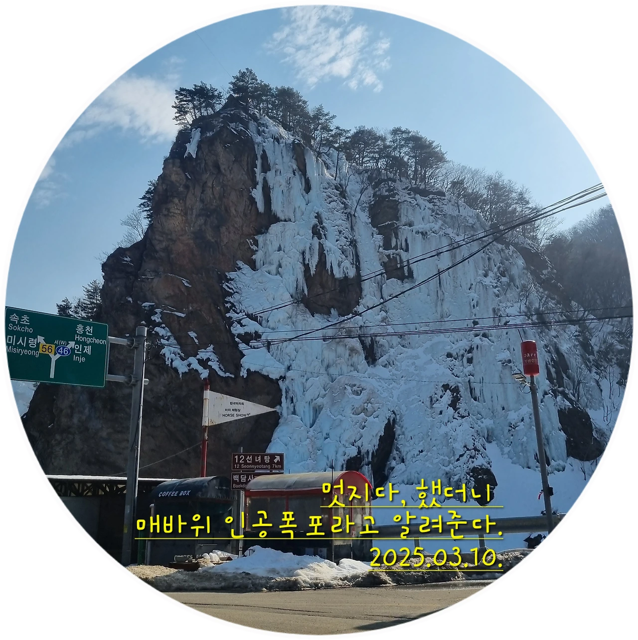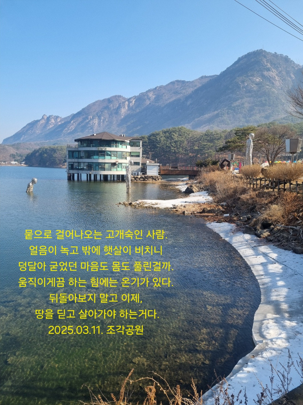 가는 길 내내 앞으로 보나 옆으로 보나 산, 거기 눈 녹은 곳과 아닌 곳이 확연히 구분되었다. 떠나지 못한 겨울과 이미 와있는 봄이 나란했다. 아직 꽃이 핀 것도 초록잎이 돋은 것도 아닌데 햇살만큼은 영락없는 봄이었다. 서울보다 강원도가 더 따뜻하게 느껴졌다. 갑자기 영상 15도까지 오르다니, 기온이 널뛴다.