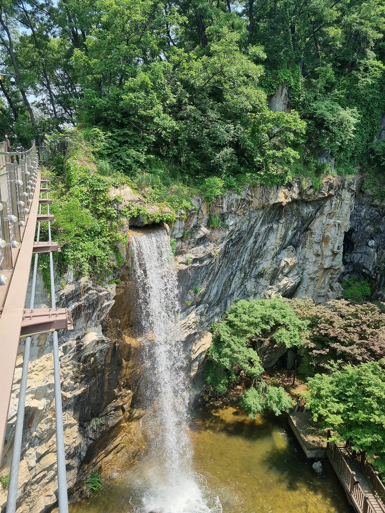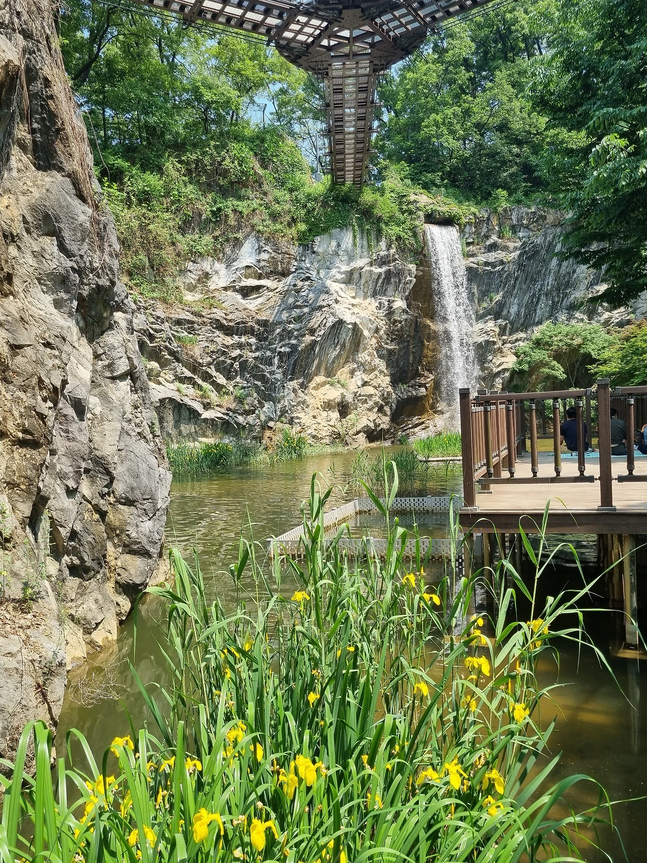 전국에 유행처럼 번진 출렁다리, 말로만 들었지 건너보긴 처음이다. 우후죽순으로 생겨나 전국에 200개가 넘는다는데 큰돈 들여 굳이... 이런 생각도 했지만 정작 겁이 많아 찾지 않았다. 그런데 이번에는 달랐다. 이왕 왔으니 건너보자,라는 마음이었다. 쇠사슬로 이어놓은 다리 난간을 붙잡고 걷는데, 다리가 '진짜'출렁댄다. 으악! 팔에 힘이 들어가고 다리는 후들후들. 간신히 사진 몇 장만 건졌다. 그리고 폭포 아래쪽 평지로 내려왔다. 땅에 발을 디디니 안심, 폭포를 바라보고 출렁다리를 올려다보니 '제대로' 안심. 쿵쾅대던 마음을 가라앉히는데 물속에 잠긴 노란 꽃창포도 한몫해 주었다.