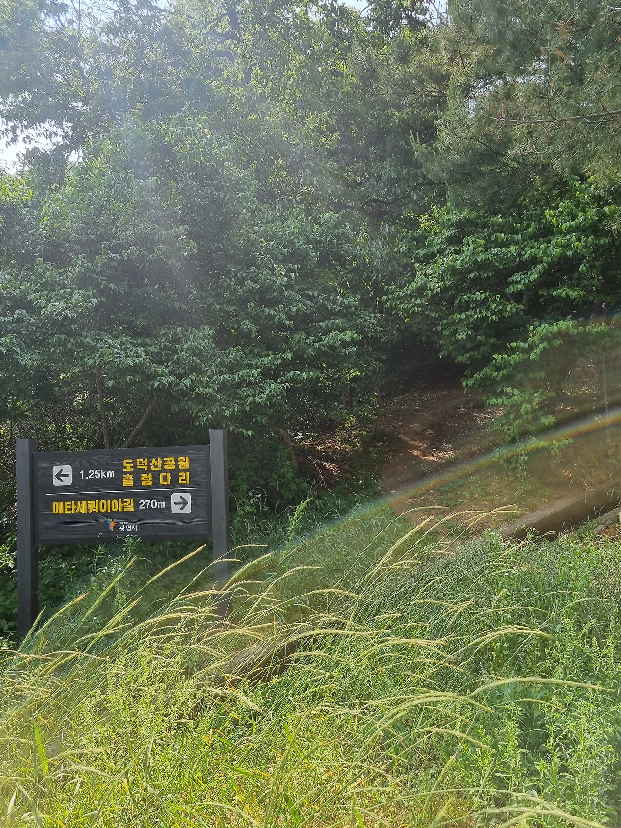 도덕산 캠핑장에 차를 세워두고 슬슬 다녀오리라, 가볍게 출발했다. 국궁터가 광명시에도 있었구나, 운학정을 살짝 엿보고 난 뒤 계속 도덕산 방향으로 걸어갔다. 걷는 데는 선수니까 가다 보면 있겠지 하고. 고작 183m라고 얕잡아 봤다. 도덕산을 만만하게 봤다. 이정표가 보이자 반가운 마음으로 숲길로 들어갔다. 그런데 경사가 장난이 아니었다. 아는 사람은 선호하지 않을 길이었다. 기왕 왔으니 출렁다리까지는 가보리라 마음먹고 올라갔다. 가는 동안 단 한 사람도 만나지 못했다. 그렇게 출렁다리까지 올라갔는데 어디로 올라온 건지, 사람들이 꽤 많았다.