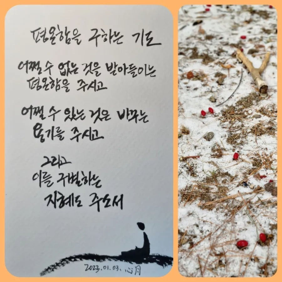이 시를 처음 접했을 때보다 큰애의 중독성 도박문제로 자조모임에 나갔을 때 깊게 다가왔던 기도문이다. 모임이 끝날 때마다 한 목소리로 읊는 기도문이기도 하다. 이제 저절로 외워지는 시다. 외워지는 것처럼 저절로 되는 것이라면 얼마나 좋을까. 적어도 읊는 순간 마음이 편안해지는 것으로 만족한다. 잠시라도 평온에 머무를 수 있음에 감사해야지!