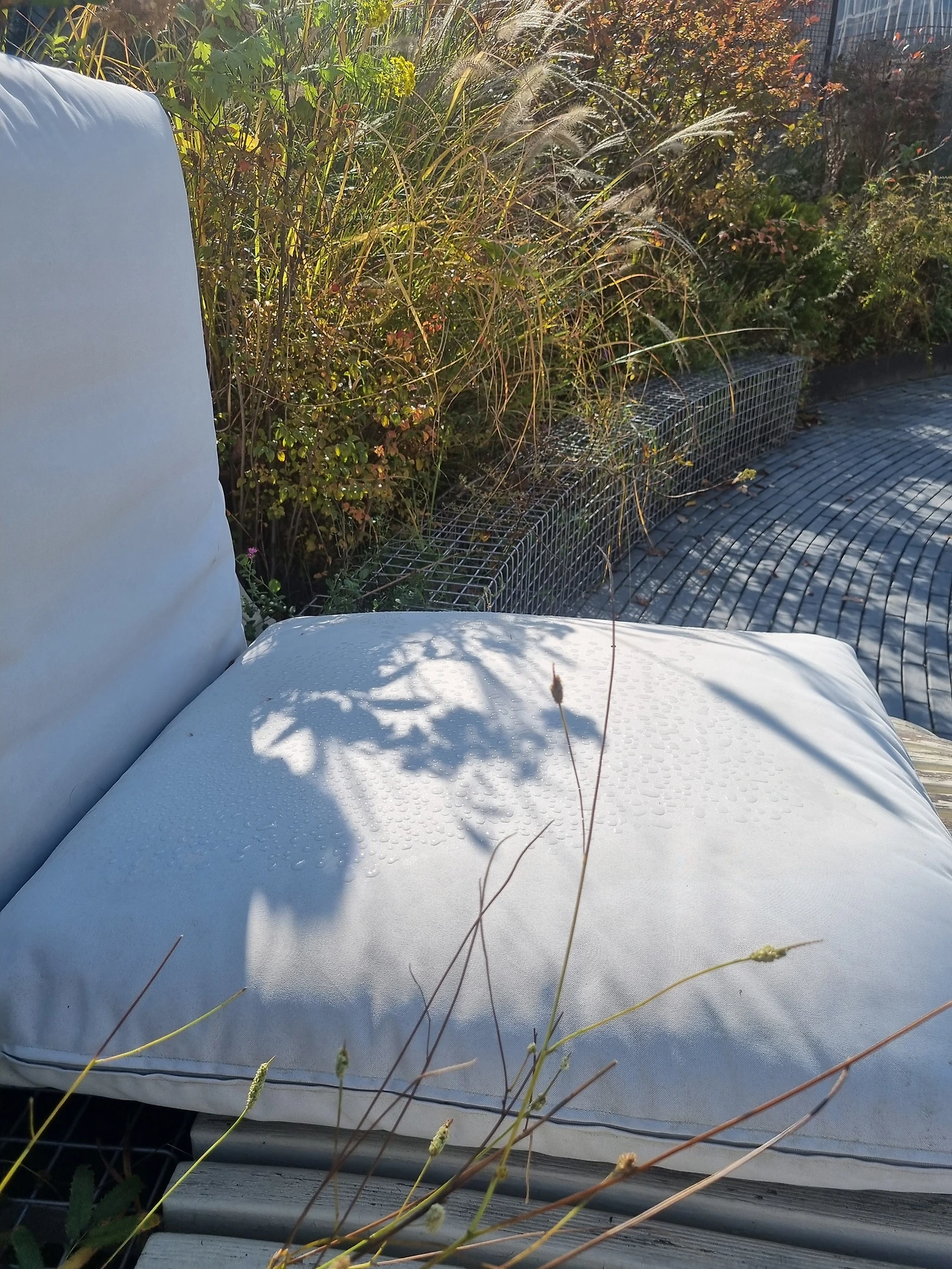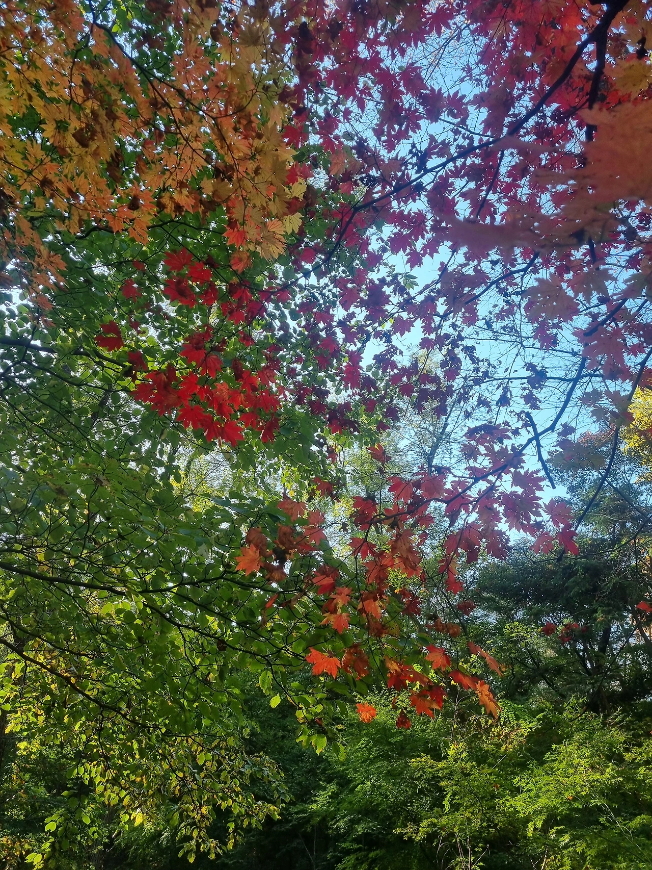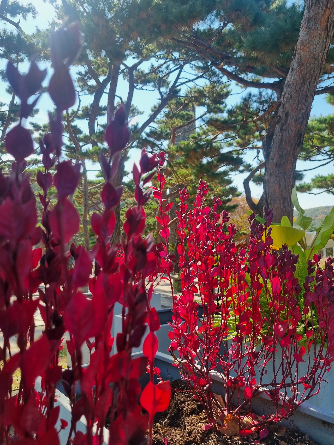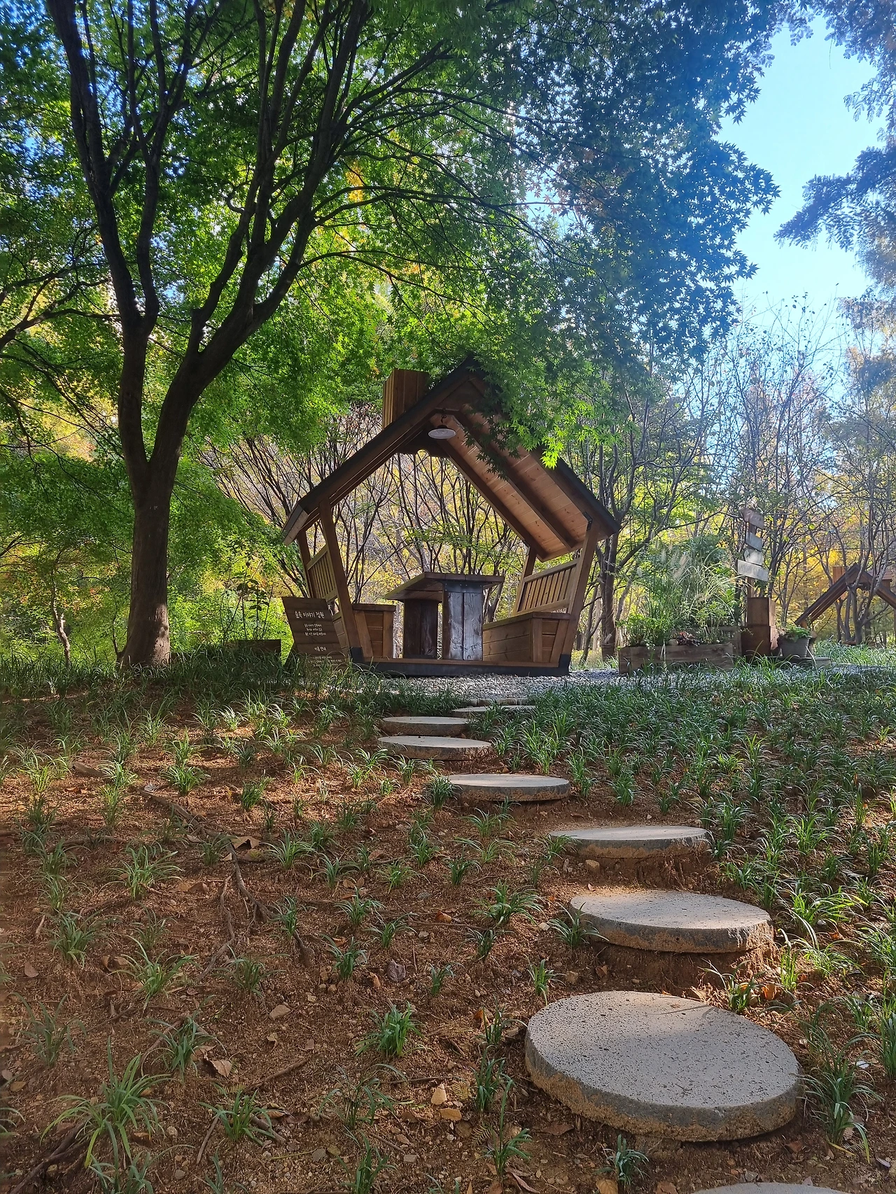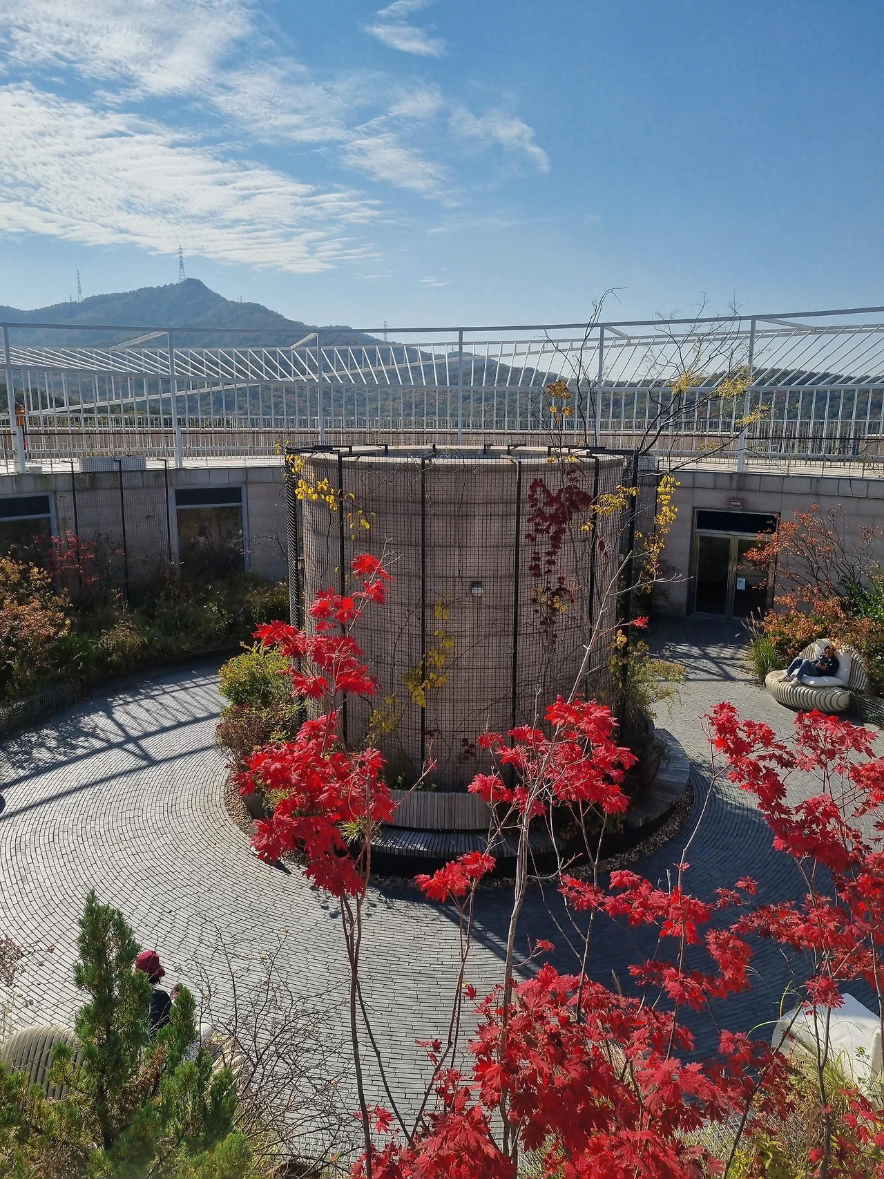 푹신한 의자에 아침이슬이 맺혀있다. 해가 먼저 든 의자에는 물기가 없어 배낭을 맡기고 가을로 가득 찬 원형정원을 한 바퀴 돈다.