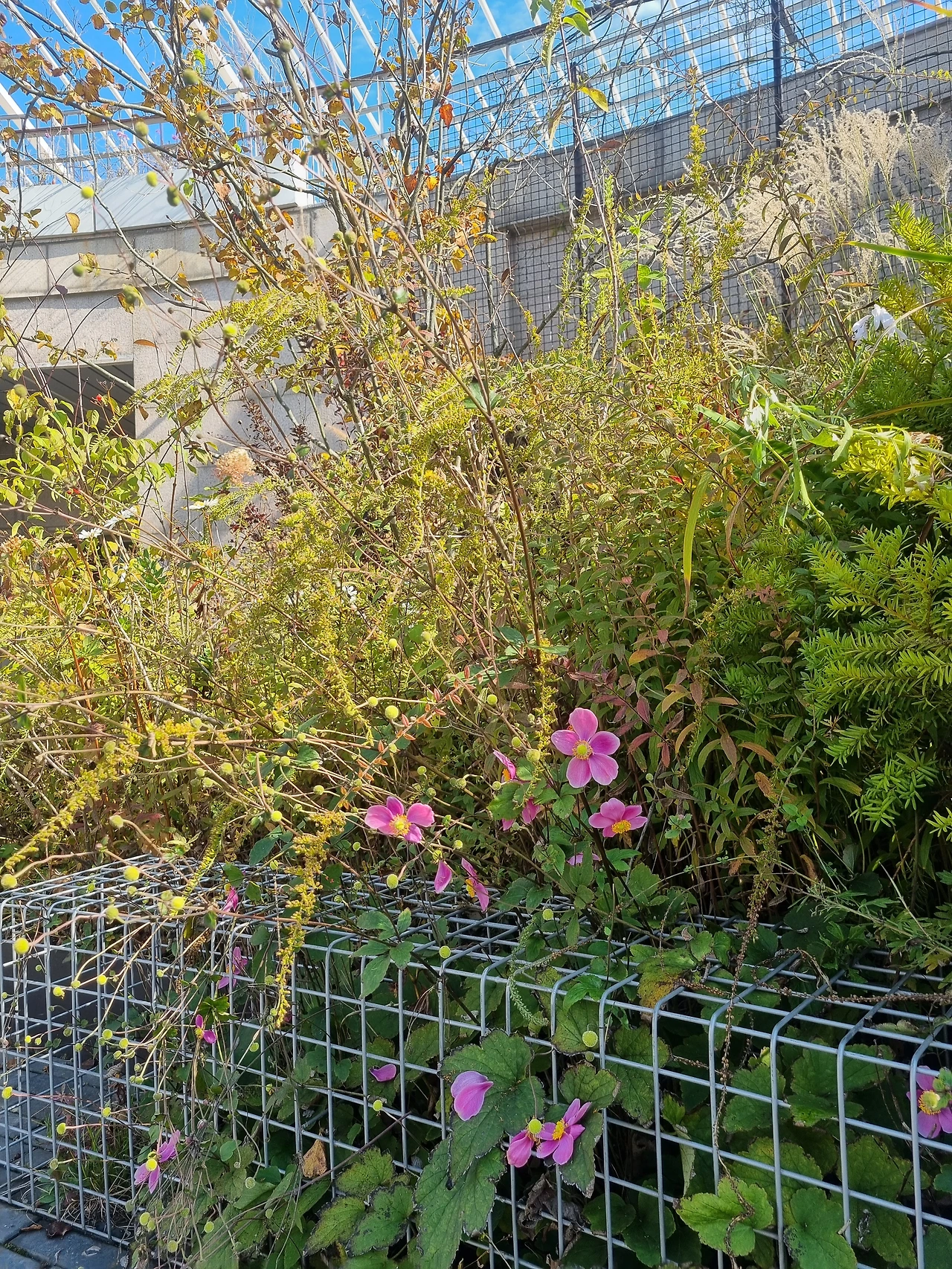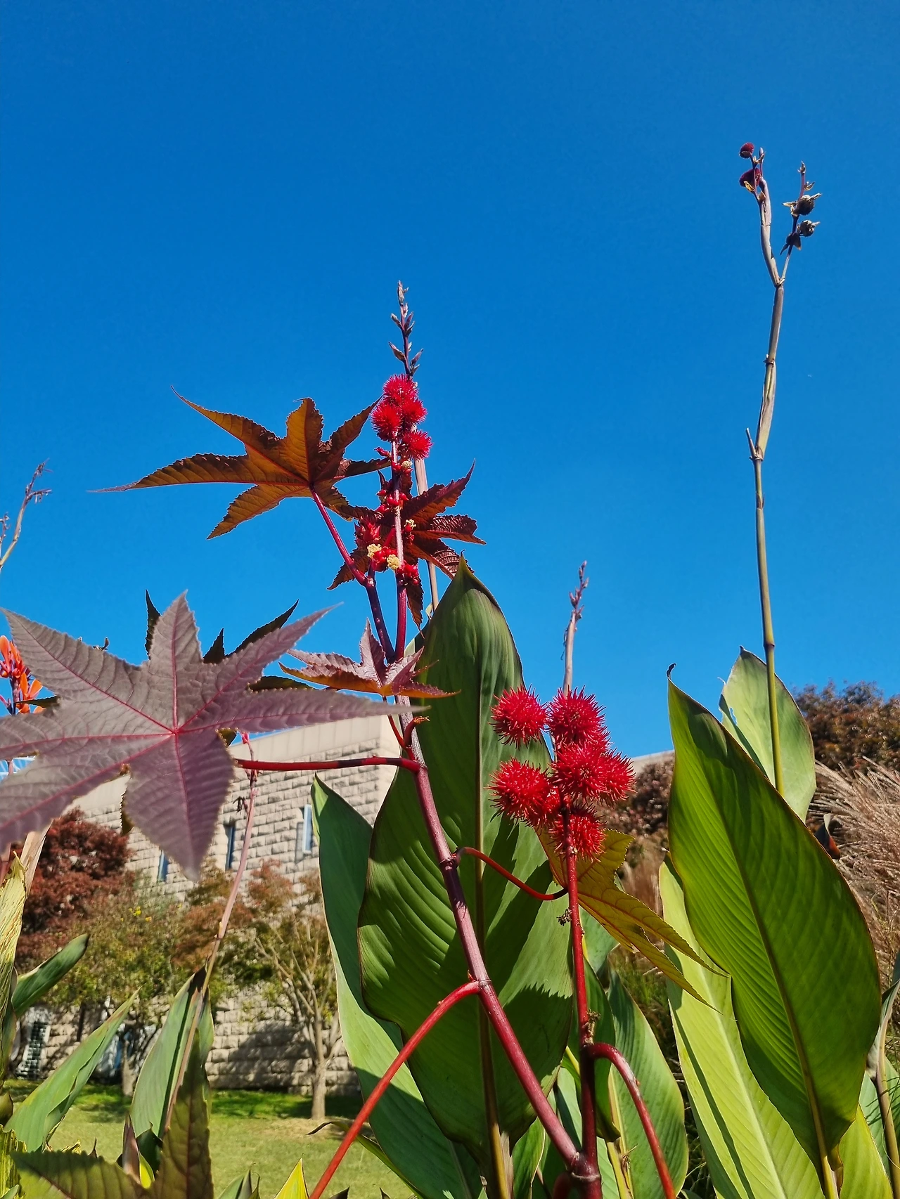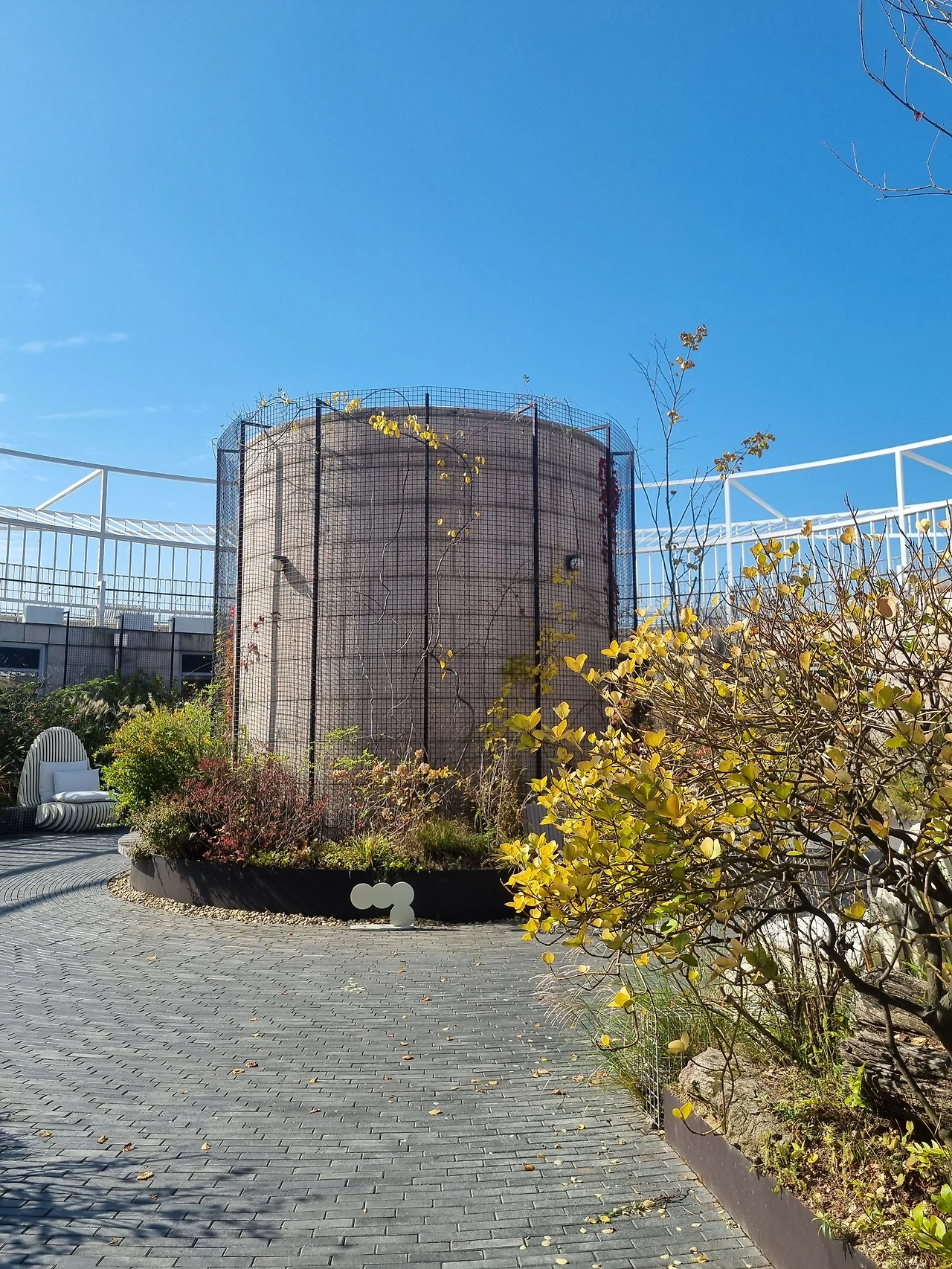 정원 한가운데, 나무 기둥을 연상시키는 원통의 건물을 타고 넝쿨식물들이 귀여운 열매를 매달고 있고.
