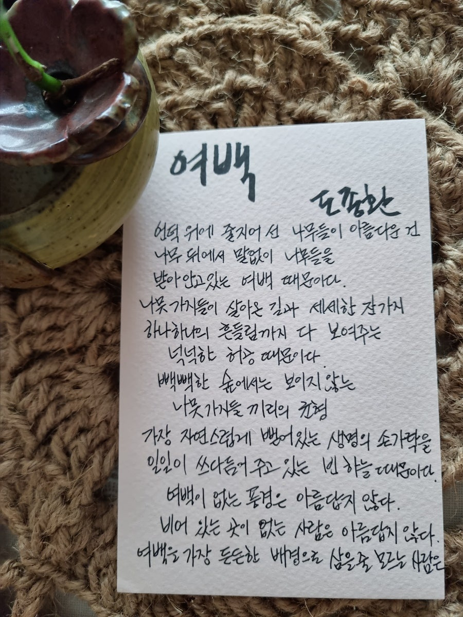 "비어 있는 곳이 없는 사람은 아름답지 않다. 여백을 가장 든든한 배경으로 삼을 줄 모르는 사람은"