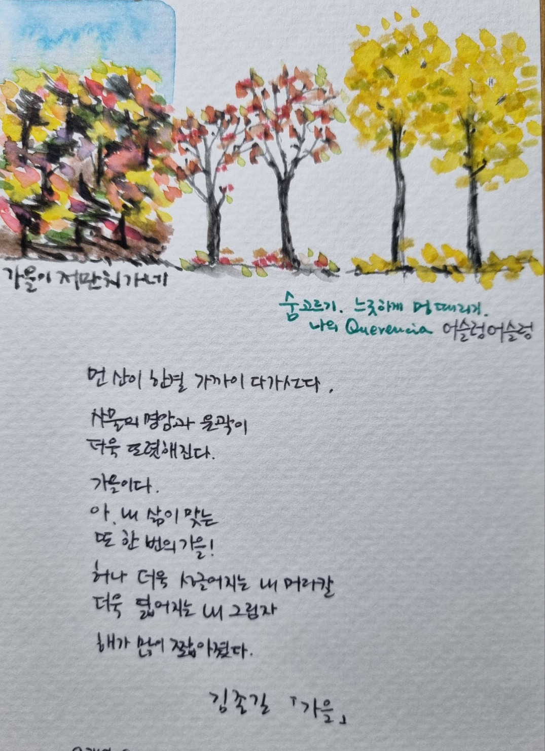 가을을 읊은 시는 많지만 김종길의 <가을>은 서서히 마음에 스민다. '내 삶이 맞는 또 한 번의 가을'을 남긴 시를 찾은 나는 '또 한 번의 가을'을 음미하고 있다. 머리카락이 성글어가는 것처럼 기억도 성글고 옅어져서 아무리 좋아도 잘 외워지지 않아 여러 번 읊으며.