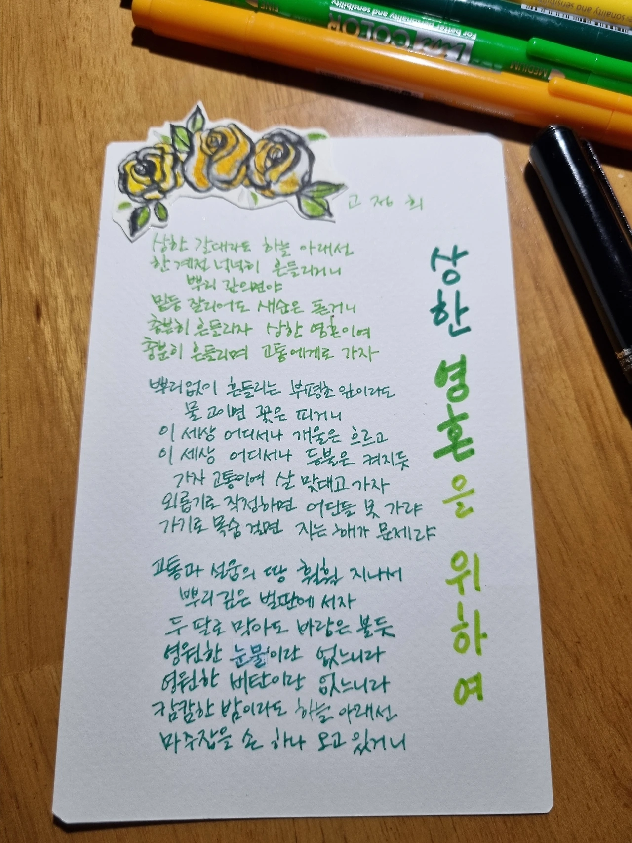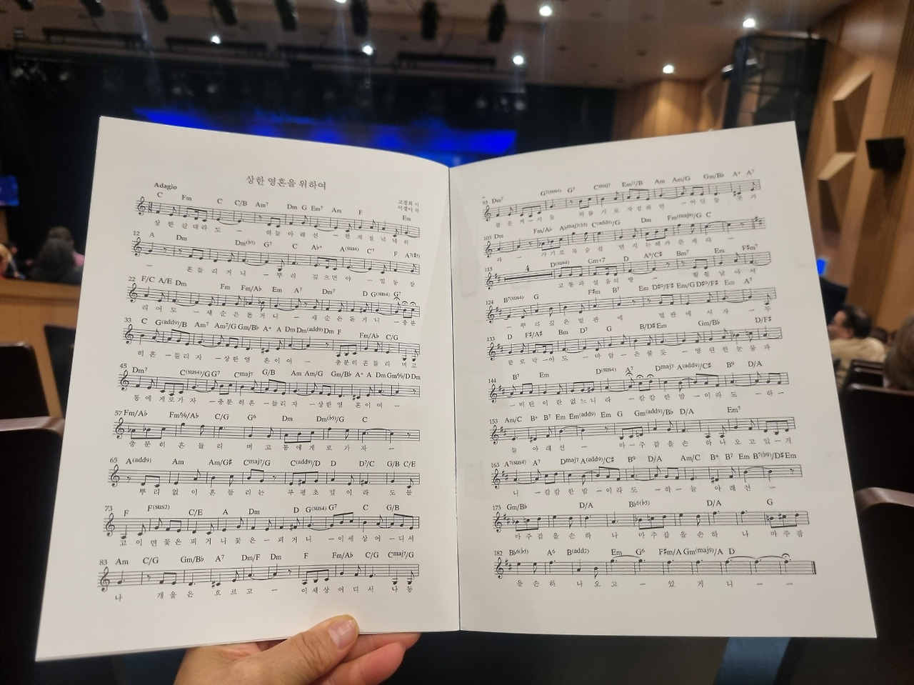 시에 높낮이가 다르고 길이가 다른 음을 보태 노래가 지어졌다. 시를 깊이 음미해야만 거기에 맞게 곡을 붙일 수 있는 걸 텐데 아무나 쉽게 할 수 있는 일은 아니란 생각이 들었다. 시에 곡조를 다는 일은 조심스러우면서도 대단한 일인 것 같다. 그날 공연 리플릿에 실린 악보를 챙겨 왔다. 시에 날개가 달렸으니 붙들어서.