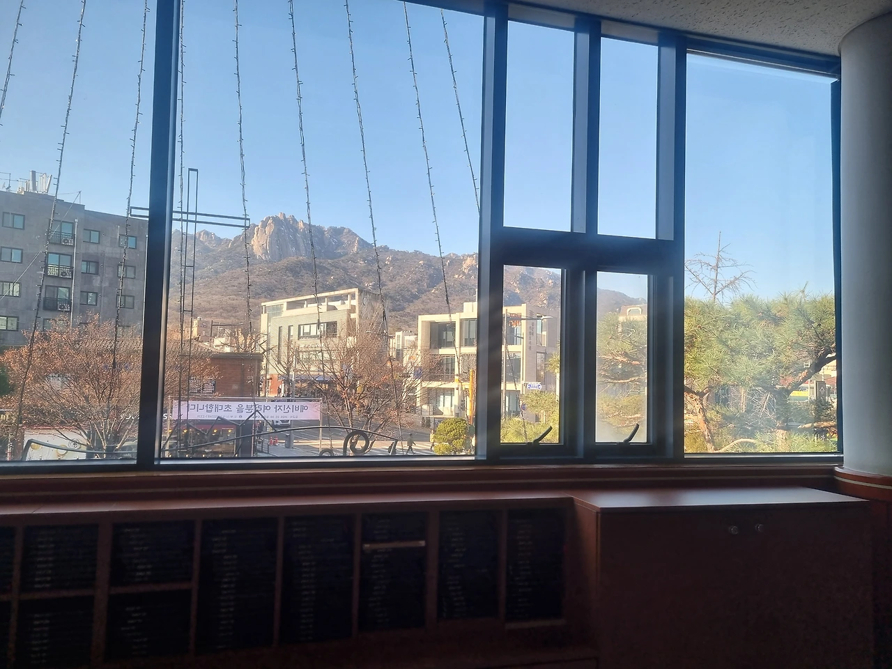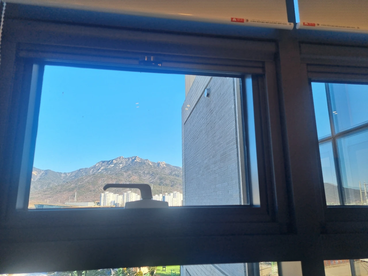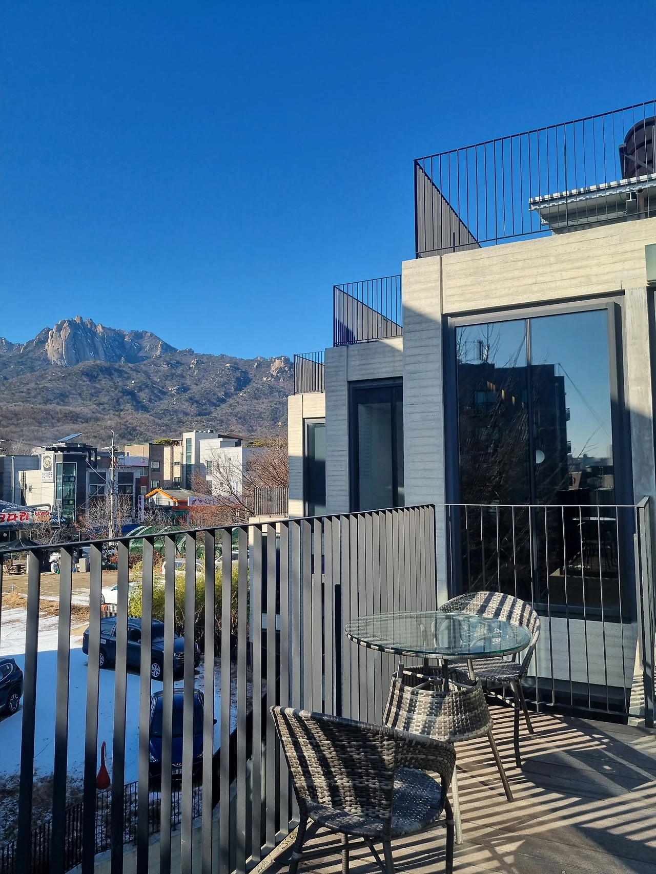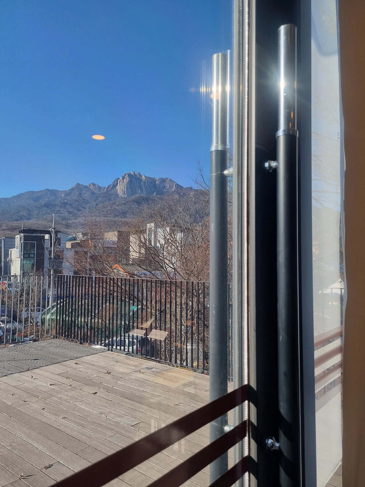 발코니에 나가 산을 좀 더 밀착해서 보고 싶었건만, 바닥이 미끄럽다고 막아놓았다.