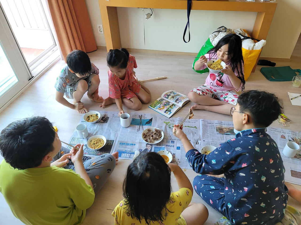 2~3시간을 놀다가 배가 고파서 그제서야 숙소로 들어갑니다. 숙소 안에는 이미 맛있는 라면과 고기가 준비되어 있습니다. 어른곰들은 익숙하게 신문지를 깔고, 아기곰들의 식사를 차립니다.