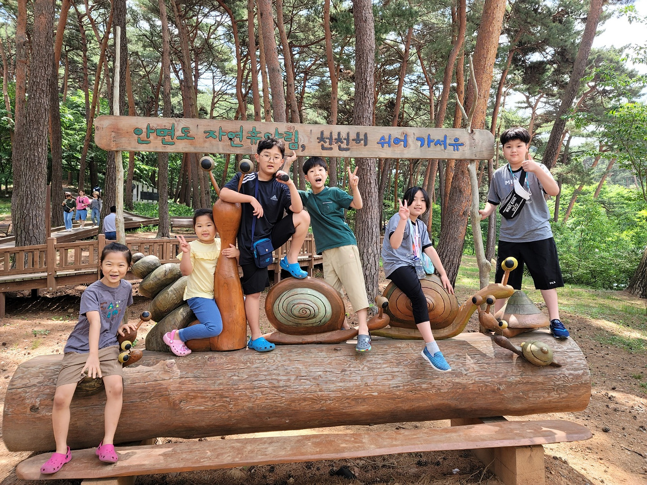 안면도를 들어보기는 했는데, 검색은 일부러 안하고 갑니다. 안면도 자연휴양림에 도착했는데, 높은 산은 아니지만 누구나 부담없이 산책을 할 수 있는 넓은 품의 휴양림이었어요. 아이들은 뾰족하지 않은 그 넓은 품에서 마음껏 산책하고 놀았습니다.