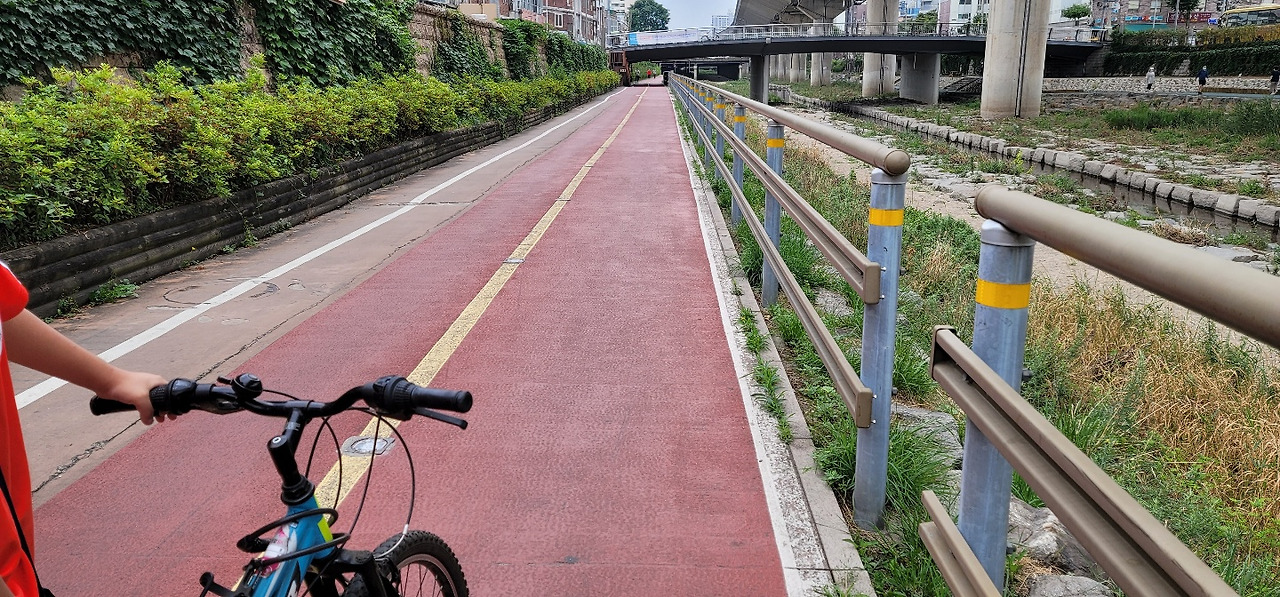 한참 뒤에는 중픙으로 다리가 불편해 보이는 할아버지께서 걸음 연습을 하고 계시네요. 아이 입장에서는 자전거 도로에서 방해가 되는 거로 느끼진 않을까 걱정되어 살짝 뒤를 돌아보니... 아들곰은 자전거 속도를 줄이고, 그 분들의 걸음에 방해되지 않게 조심히 비켜서 옵니다. 자전거 도로지만 그 분들을 배려하는 게 맞는 거라고 말하고 싶었는데, 이미 그렇게 생각하고 있는 사춘기곰에게 잔소리처럼 들릴까봐 아무 말도 하지 않았습니다.