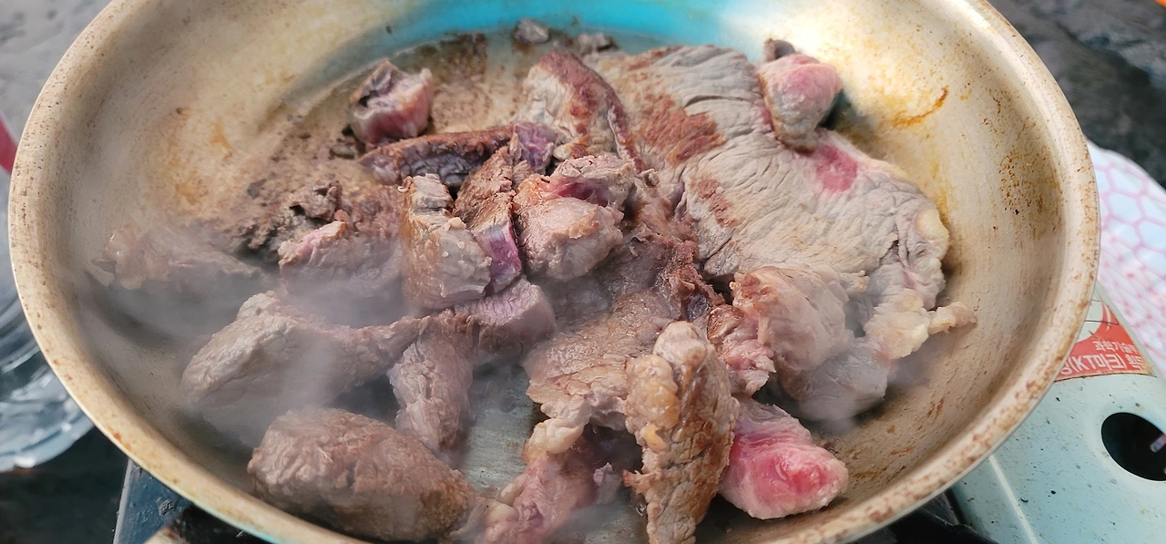 눈을 뜨자마자 우리집 래브라도 리트리버 오레오처럼 음식에 꽂혀서 잠도 덜 깬 상태로 고기를 굽는다. 프라이팬 가득 안심 등심을 올려놓고 그냥 막 휘저었다ㅎㅎㅎ