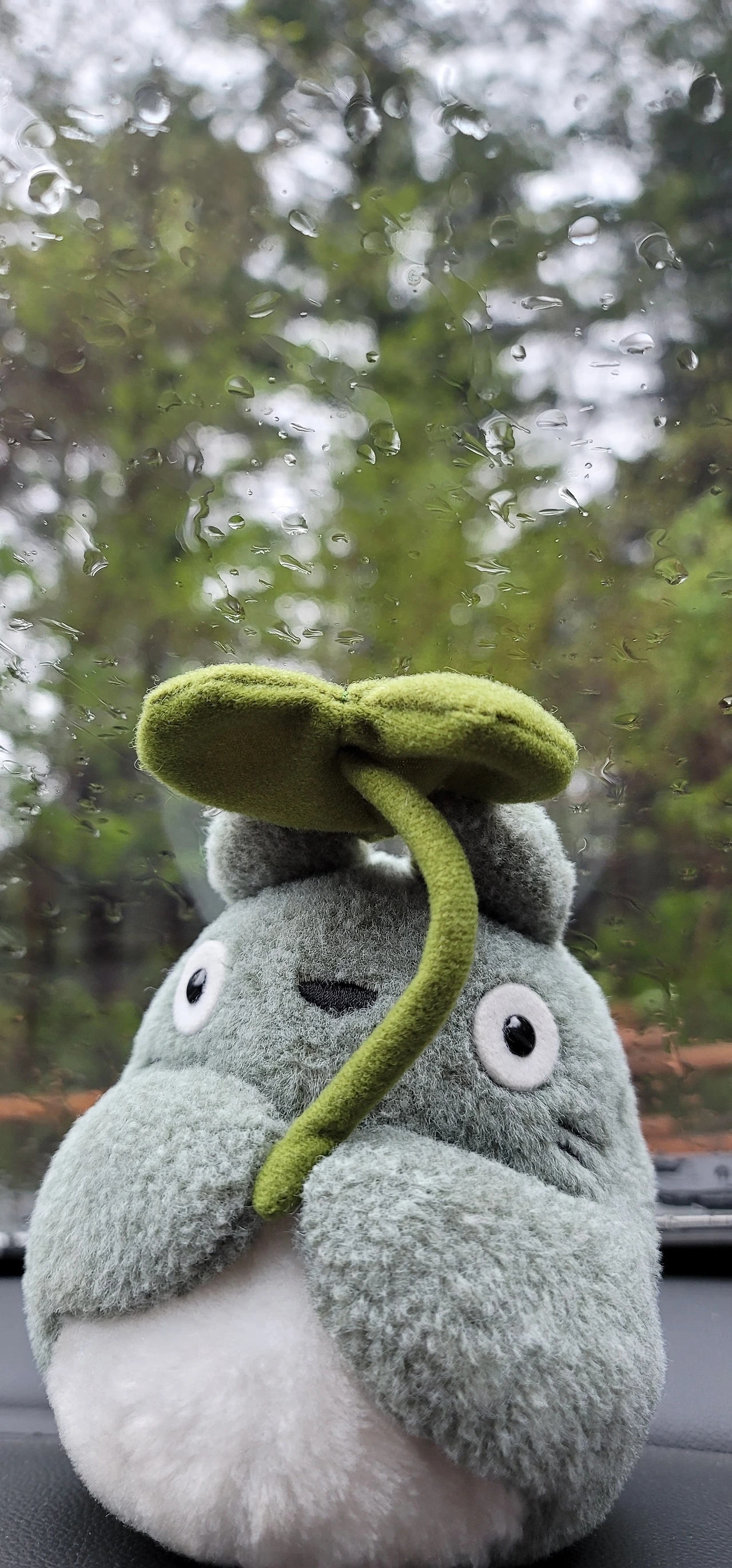 차 안에 놓인 토토로 인형이 청태산에 내리는 비를 피하고 있다.