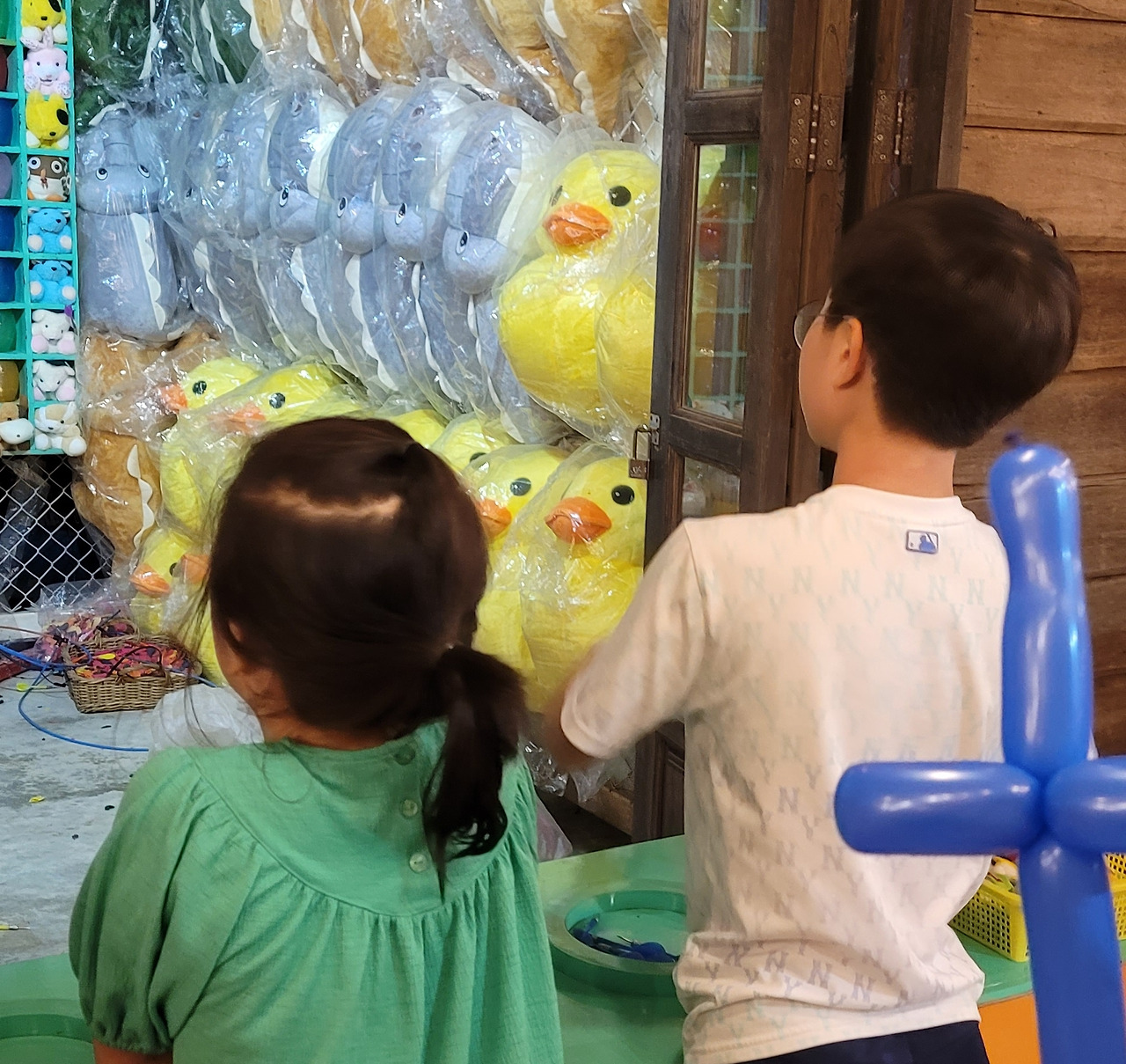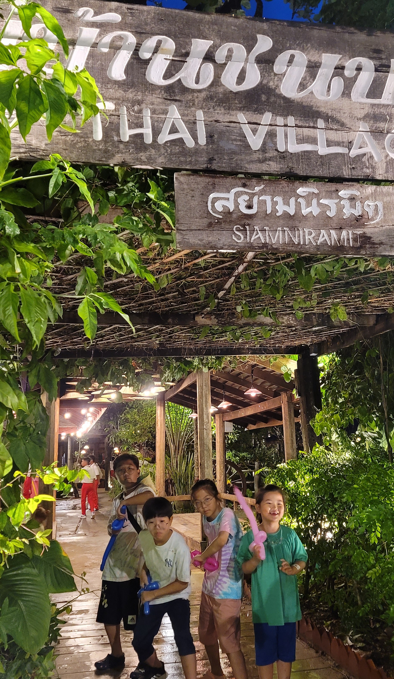 시암니라밋 공연장에서 저녁식사를 하고, 공연 전까지 시간이 남아서 타이빌리지 라는 인공유원지에서 물풍선쏘기, 사격놀이 등을 합니다. 어른인 제 눈에는 절대 아이들 힘으로 이길 수 없는 놀이지만, 아이들은 자신들이 상품을 타는 상상을 이미 하고 있기 때문에 돈을 걸고 게임을 시작합니다.