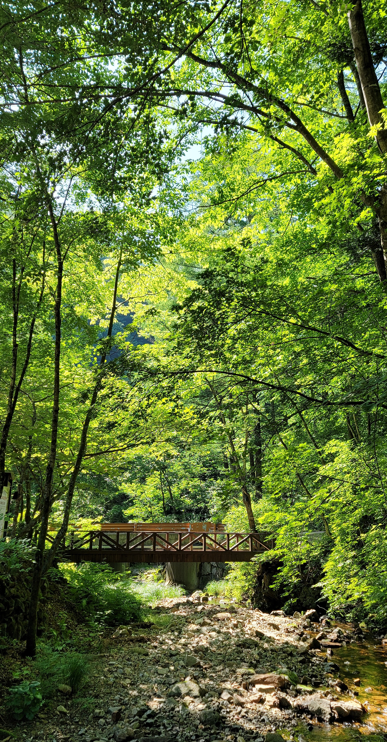 아침 산책에서 만나는 삼봉휴양림은 물소리와 새소리가 가득합니다. 자연이 주인이고 사람들은 잠깐 오가는 엑스트라정도로 느껴지는 원시림입니다. 이곳이 우리나라의 허파가 아닐까 생각될 정도로 숲이 내뿜는 청량한 밀도 높은 공기가 내 코와 기관지, 폐속으로 들어가고, 그것도 부족해 하염없이 숲 밖으로 밖으로 넘쳐흐릅니다.