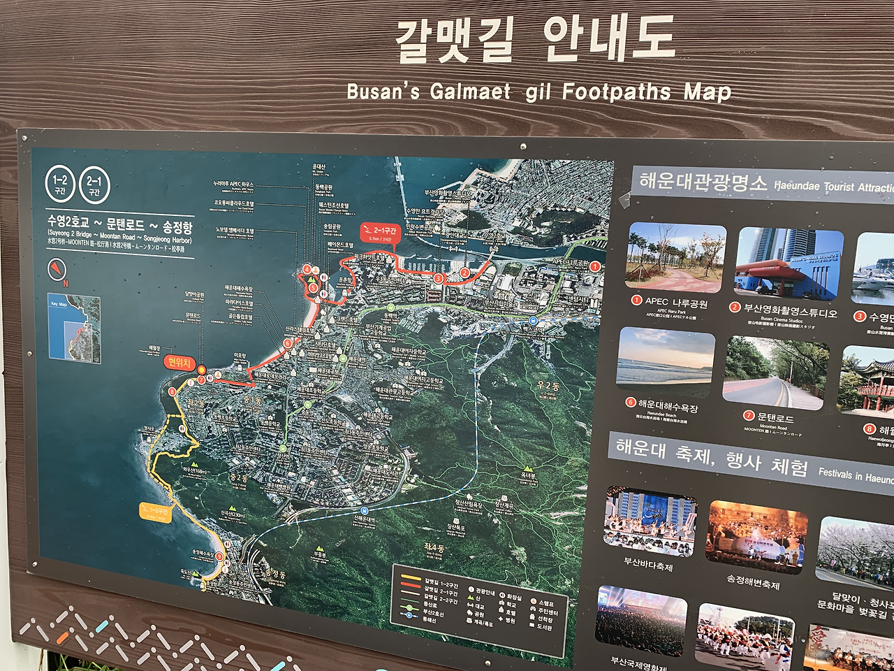 해파랑길은 총 750km의 장거리 걷기 여행길로, 부산부터 통일전망대까지 동해안을 따라서 조성된 길이다. 10개 구간, 50개 코스의 스탬프 기점으로 나눠져 있다. 이 중 1~4코스가 부산 구간으로 총 68.5킬로의 거리다.