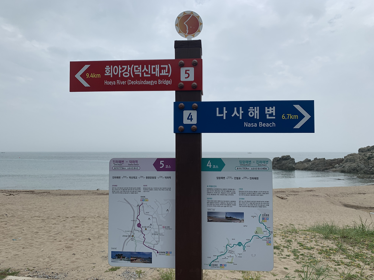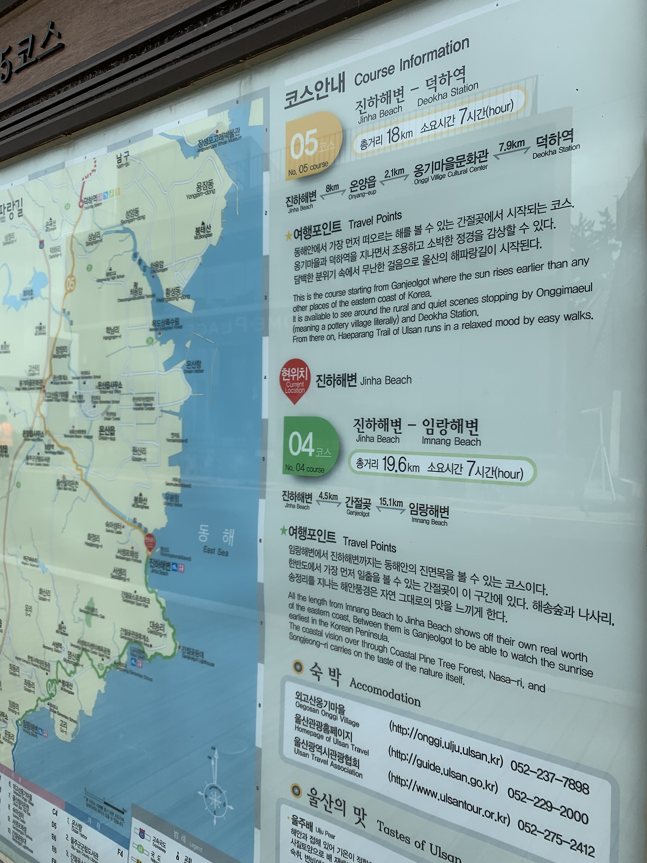 4코스는 정말 도전적인 코스였다. 코스가 길기도 하고(예상시간 7시간), 일부는 부산, 일부는 울산에 있어 고립감이 있는 코스다. 나는 해운대에서 출발, 버스를 타고 기차역에 가서 국철을 타고 울산 남창역에 하차, 다시 택시를 태고 진하해변으로 갔다. 코스 지점까지 가는 데만도 2시간 반 가까이 소요되었다.