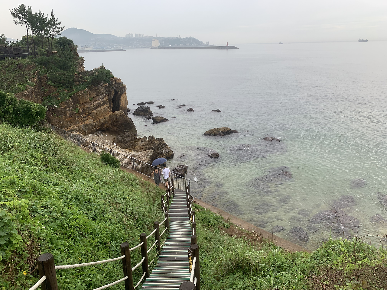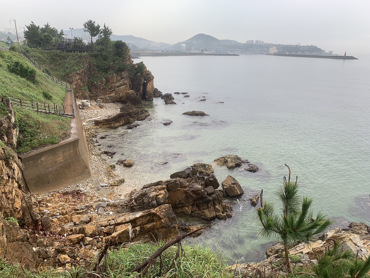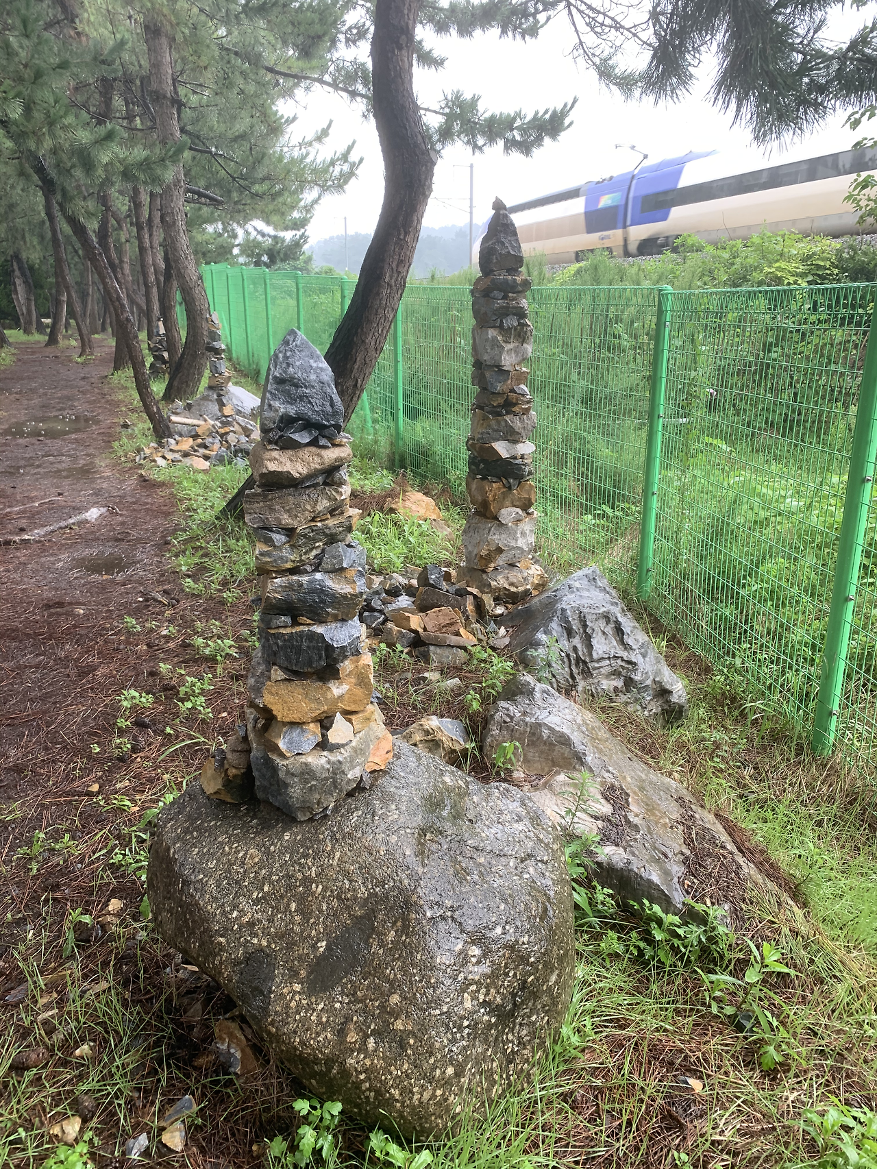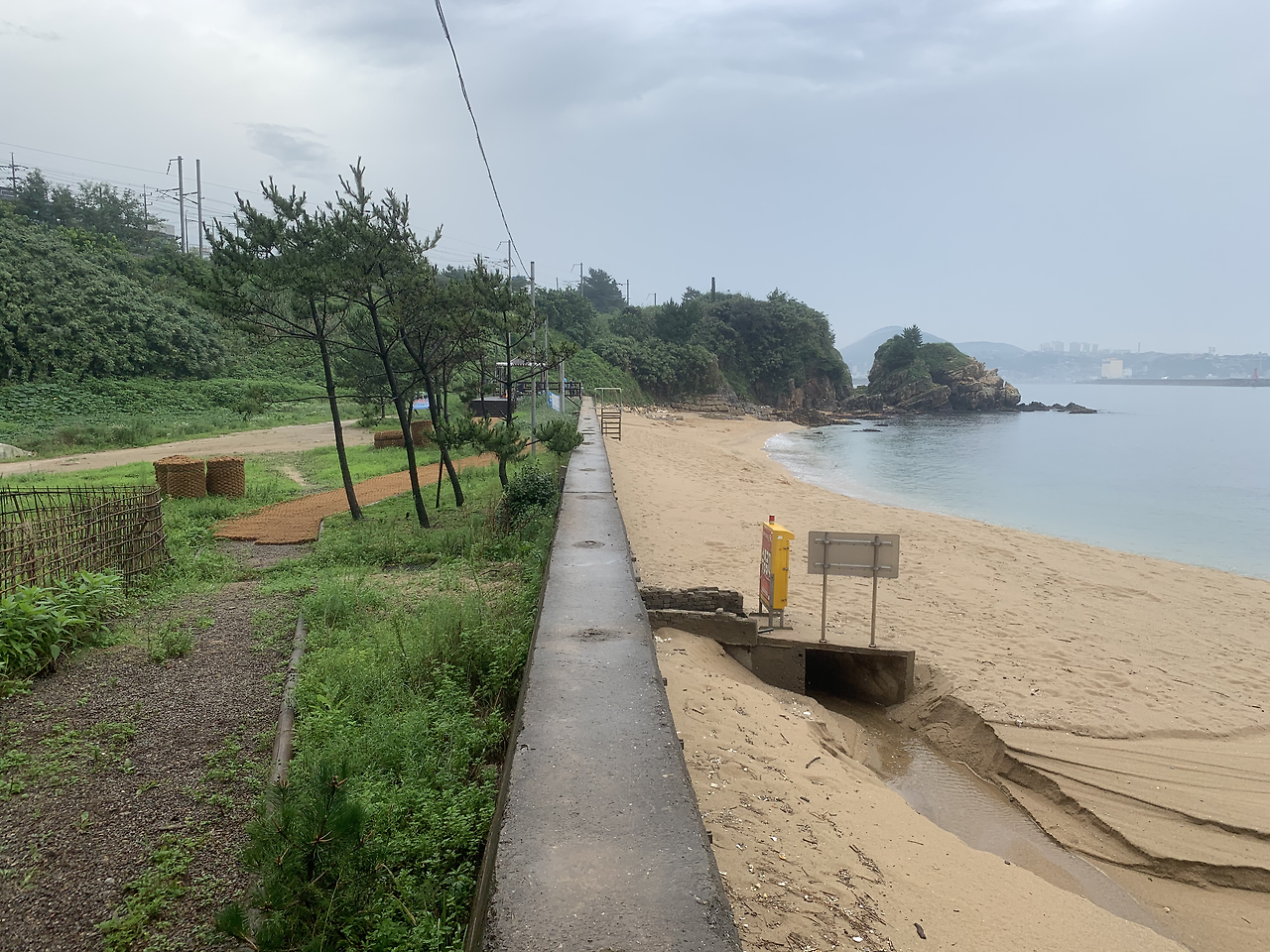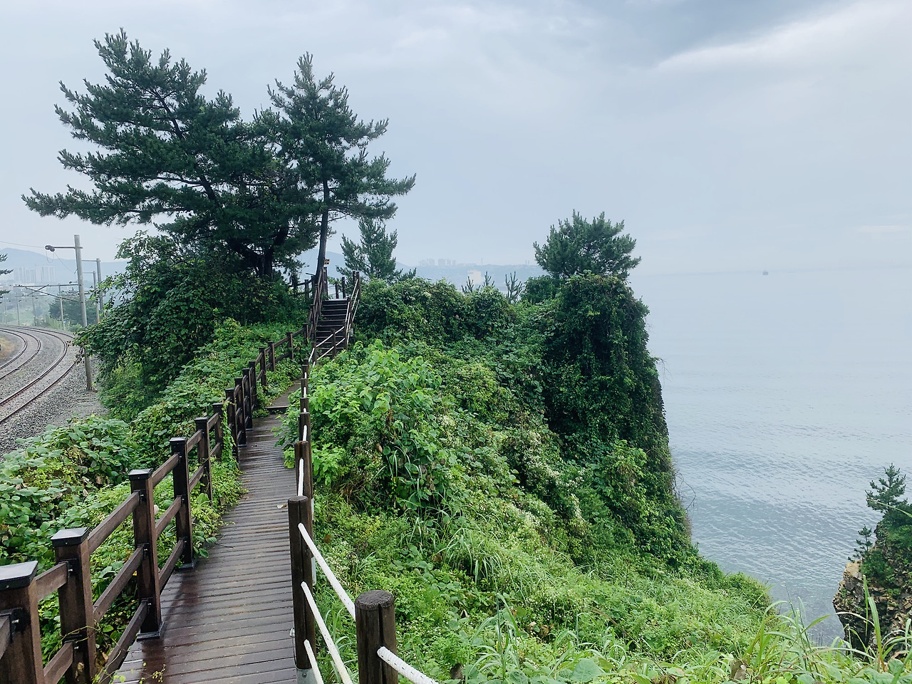 이 구간 길이 정말 좋다. 걸으면서 내내 기분이 좋았다. 오른쪽은 바다, 왼쪽은 철길. 동해안 해안길을 걷는 맛과 멋이 이런 게 아니겠나. 하지만 비가 오다 말다 하니 계산에서 미끄러지지 않도록 좀 집중해야 했다. 비 냄새, 바다 냄새, 풀냄새가 뒤섞여서 습하지만 상쾌했다. 맑은 날 걸어도 좋을 것 같다.