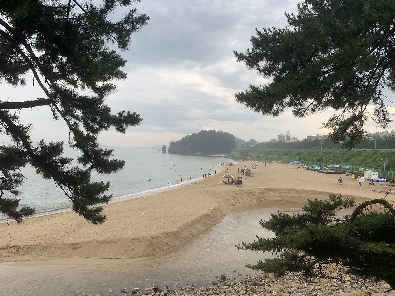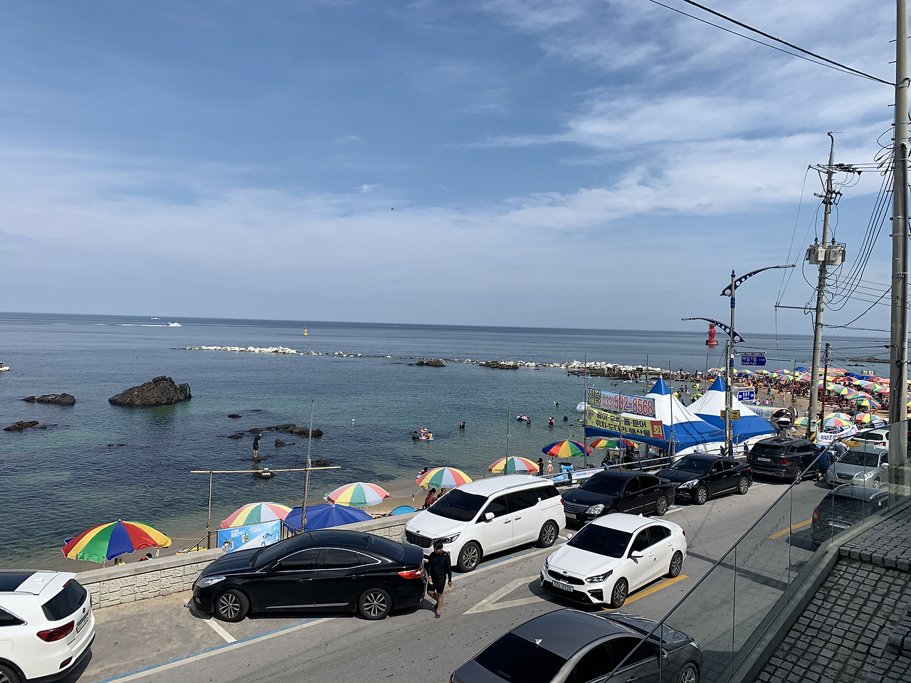 너무 땡볕이라 그런가, 코로나 영향인가 도보길 위에는 사람이 정말 없었다. 망상해변에 도착하자 그제야 사람들이 눈에 좀 띄었다. 해수욕장 입구에서 체온 측정과 신원기록 등을 진행하고 있는 것으로 보였다. 생각보다는 사람이 좀 있었지만, 성수기 점심시간임에도 가게들은 대개가 텅텅 비어있었다.