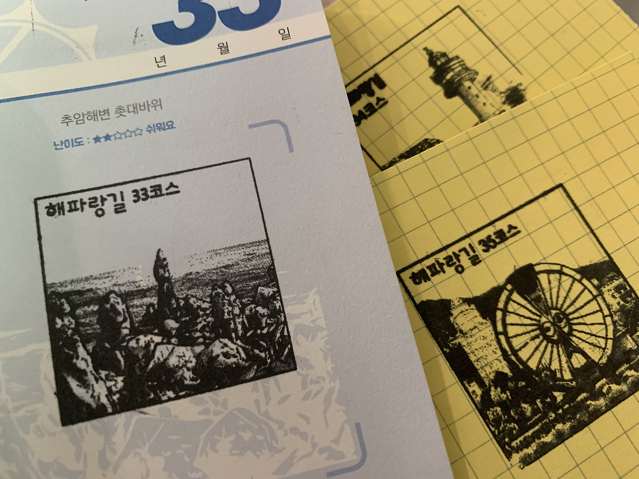 이 구간은 해파랑길 스탬프가 예쁘다. 그리고 스탬프함을 찾기가 어렵다. 꼭 알아두자, 찾기가 어렵다. 33코스는 아래와 같이 묵호역 인근 기둥 뒤에 숨어있다. 정확한 주소를 치고 지도 앱으로 찾아가야 한다. 참고로 34코스 코스 끝 지점의 스탬프함(35코스 스탬프)은 정말 황당할 지경인데, 안내된 코스에서 1km 이상 떨어진 곳에 스탬프함이 있다. 스탬프를 찍으려면 왕복 2km를 더 걸어야 한다는 것. 지역 시장을 경유하게 유도하는 모양인데, 처음에 좀 헷갈렸다. 해파랑길은 사전에 스탬프함 주소를 미리 확인하고 출발하는 것이 중요하다. 매번 조금씩 헤매게 된다.
