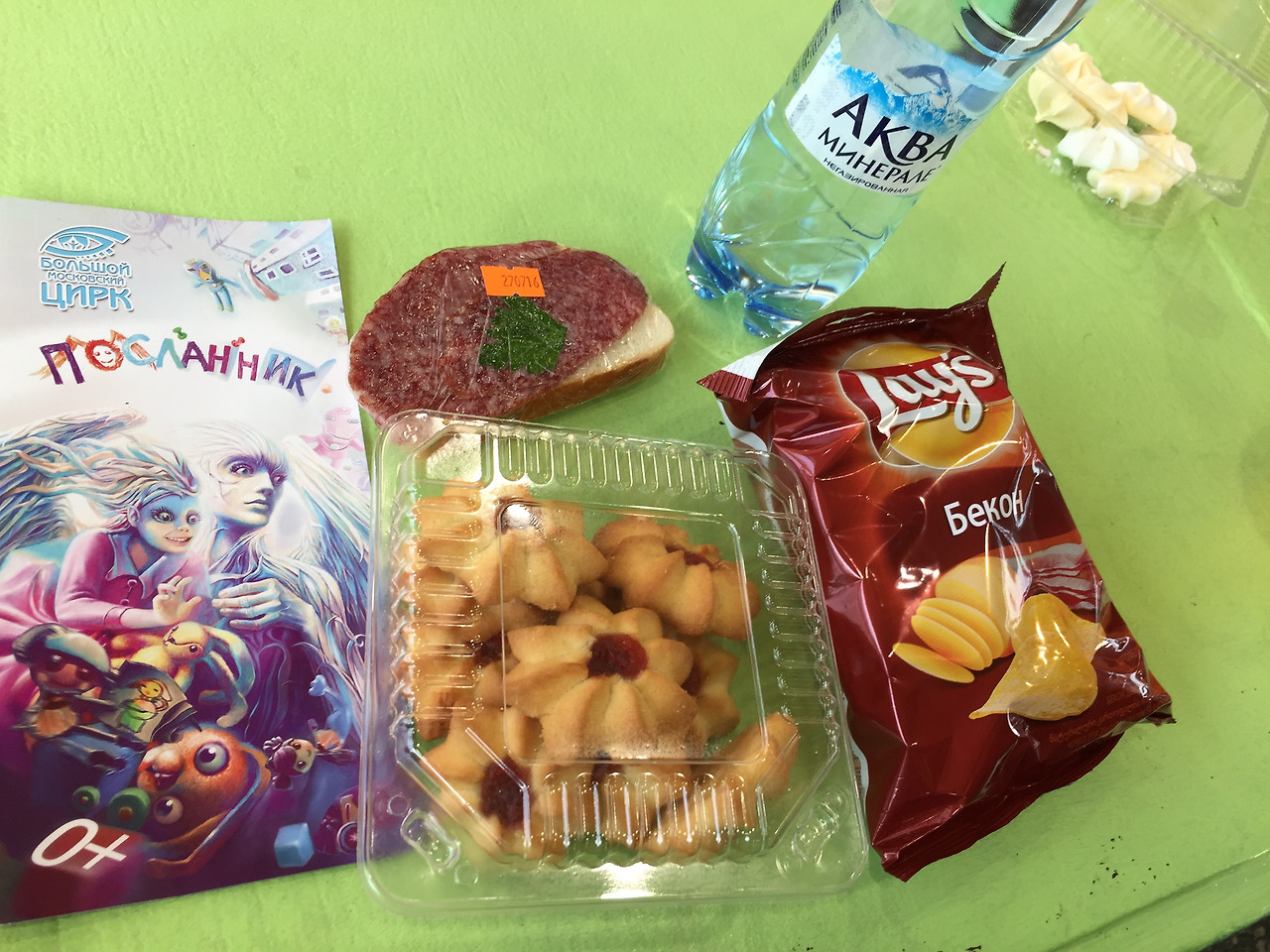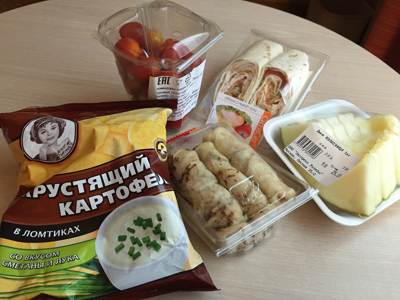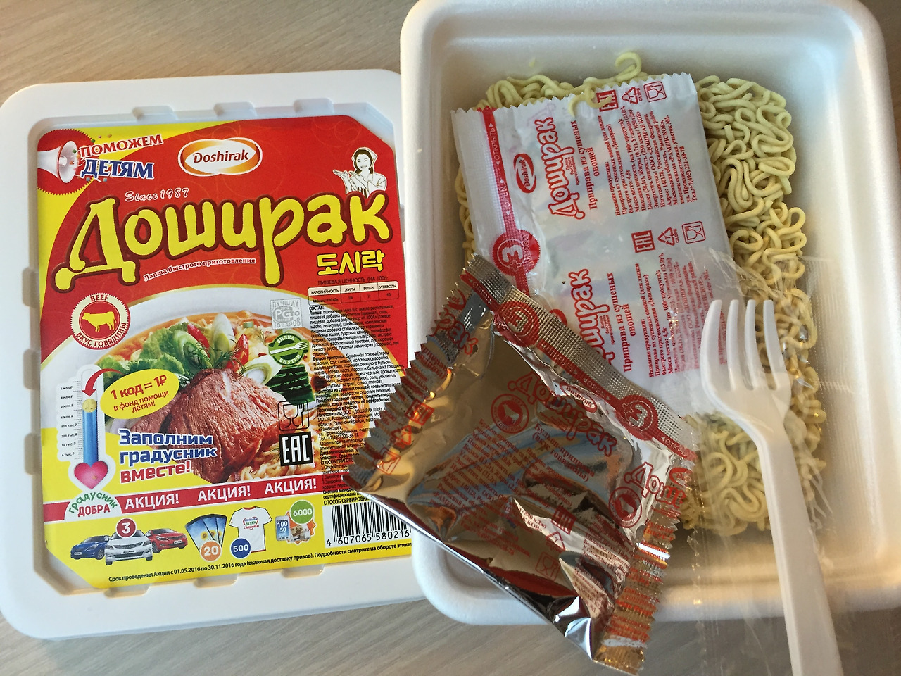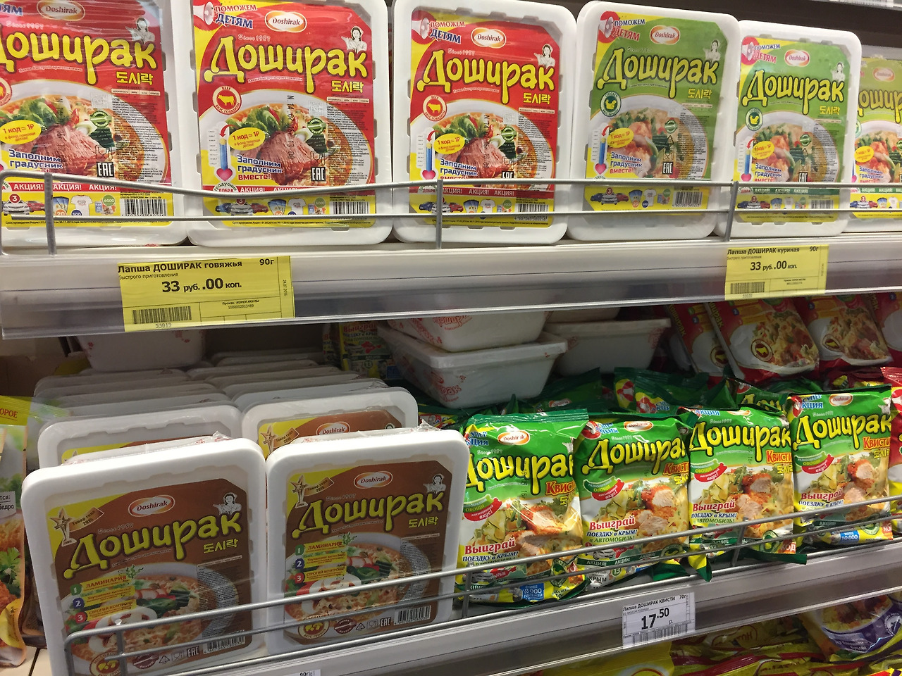 [도시락] 팔도 도시락이 러시아 히트상품이라더니 정말 큰 슈퍼 작은 슈퍼 가리지 않고 컵라면이 있는 어디에나 있다. 다양한 맛이 팔리고 있고, 한국에는 없는 도시락 봉지라면도 있다. 맛은 한국 컵라면보다 덜 짜고 순하다. 물론 맛은 비슷하다. 컵라면 안에 "포크"가 들어있다. 롯데 초코파이와 한국 껌도 흔히 만날 수 있다.