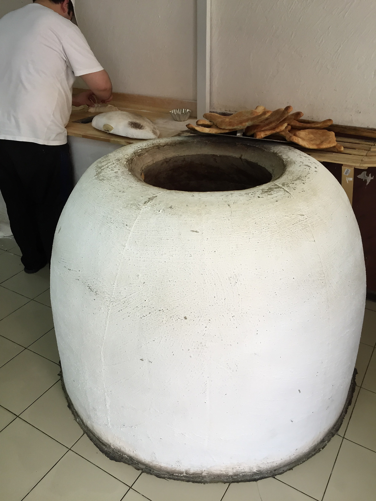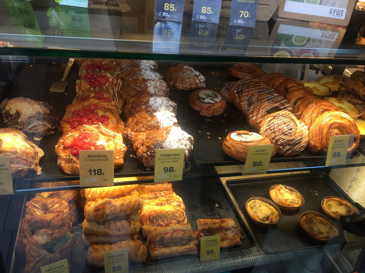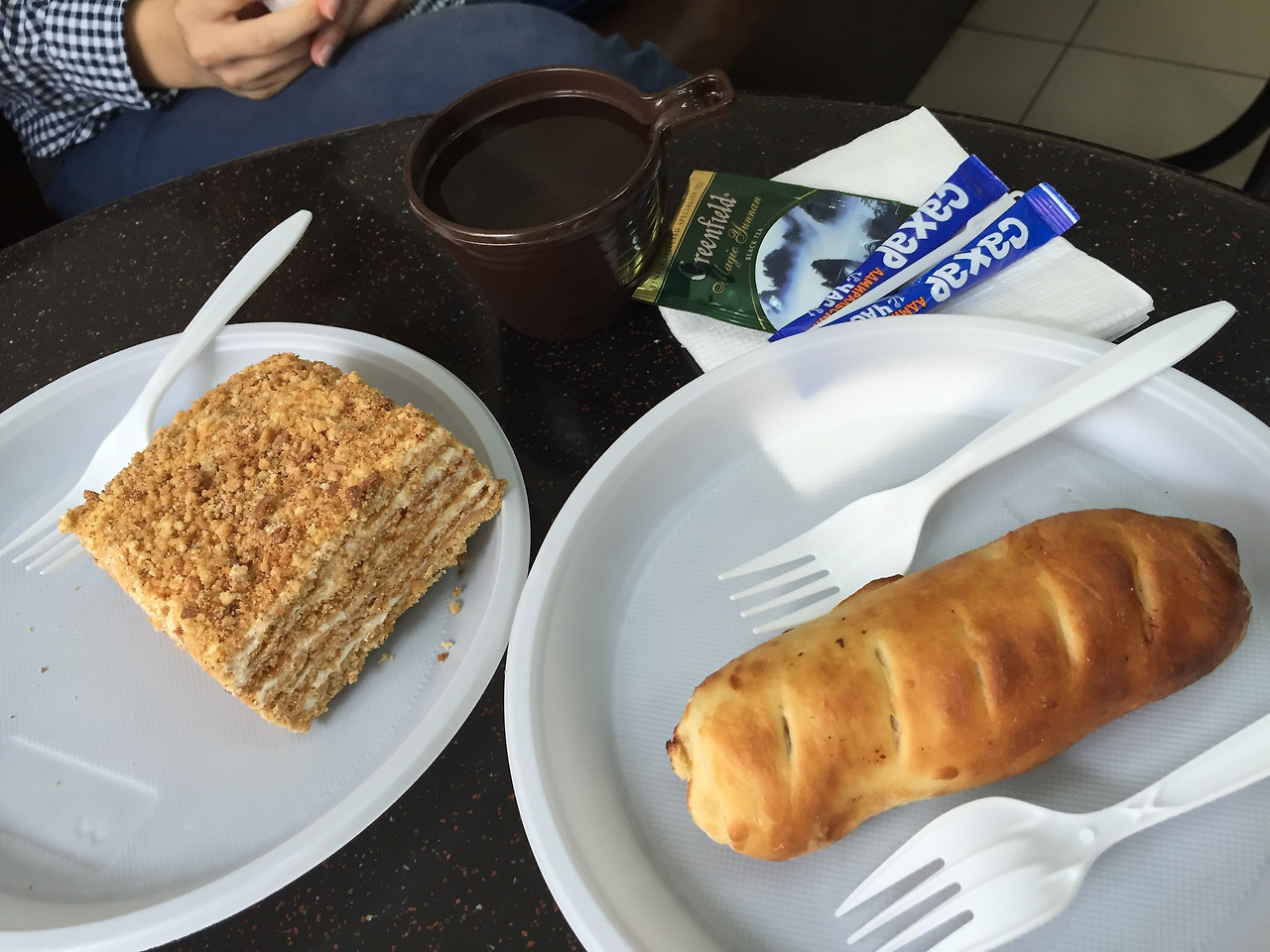 [간식/디저트] 정말 달고 화려한 디저트가 많다. 가장 러시아적인 것은 '미도빅'이라는 층층이 쌓인 케이크. 가게 반복판에 하얀 화덕을 놓고 빵을 굽는 빵집에서 사 먹었다. 화덕이 인상적이라 사진도 찍어두었다. 인도 난을 굽듯이 납작한 빵을 붙여서 굽고 있었다. 정말 빵 냄새가 온 거리에 퍼졌다. 겨울에는 자연스럽게 난로 역할도 할 것 같다.