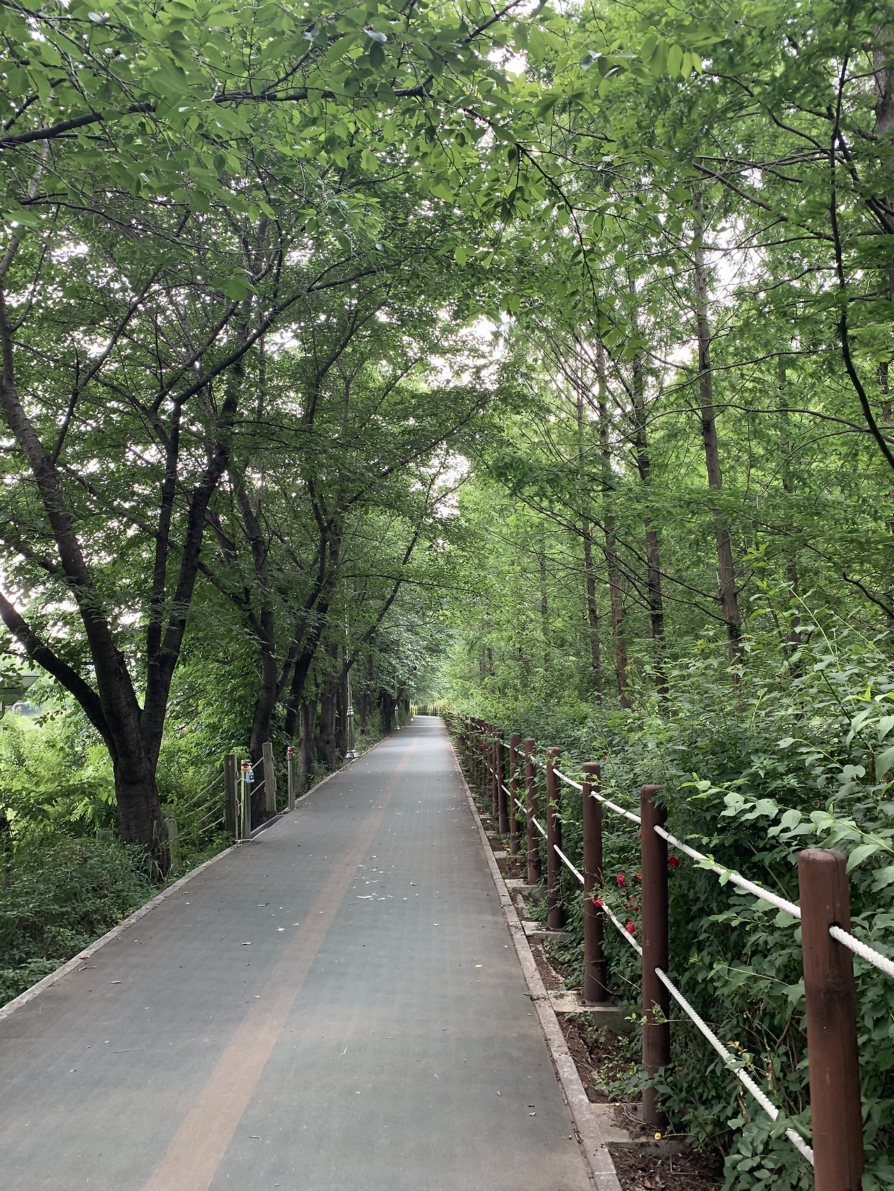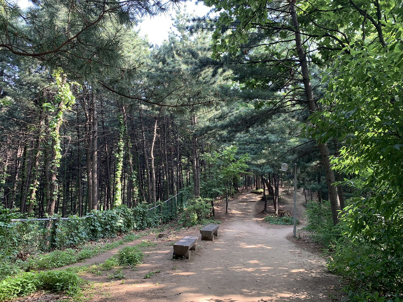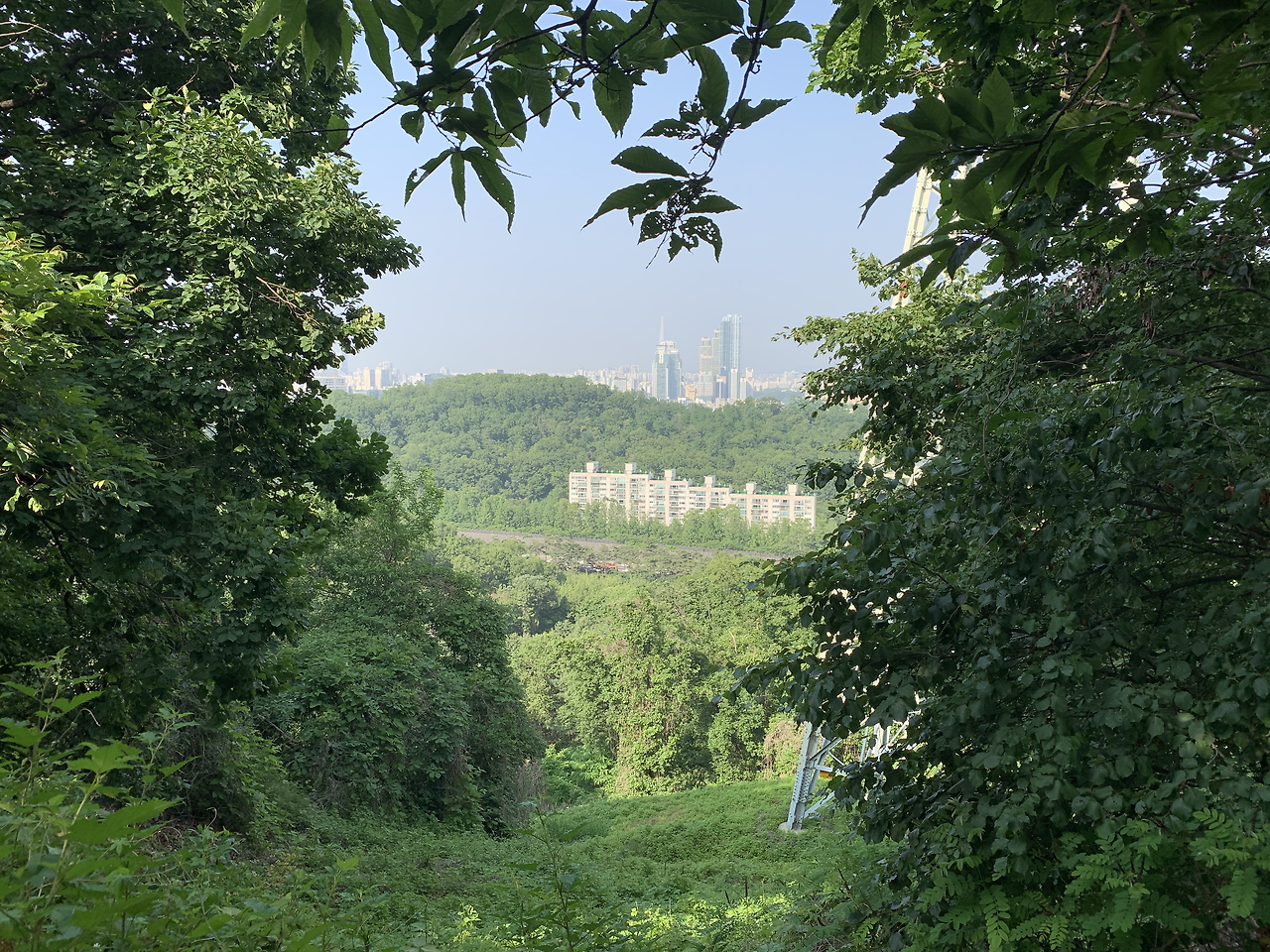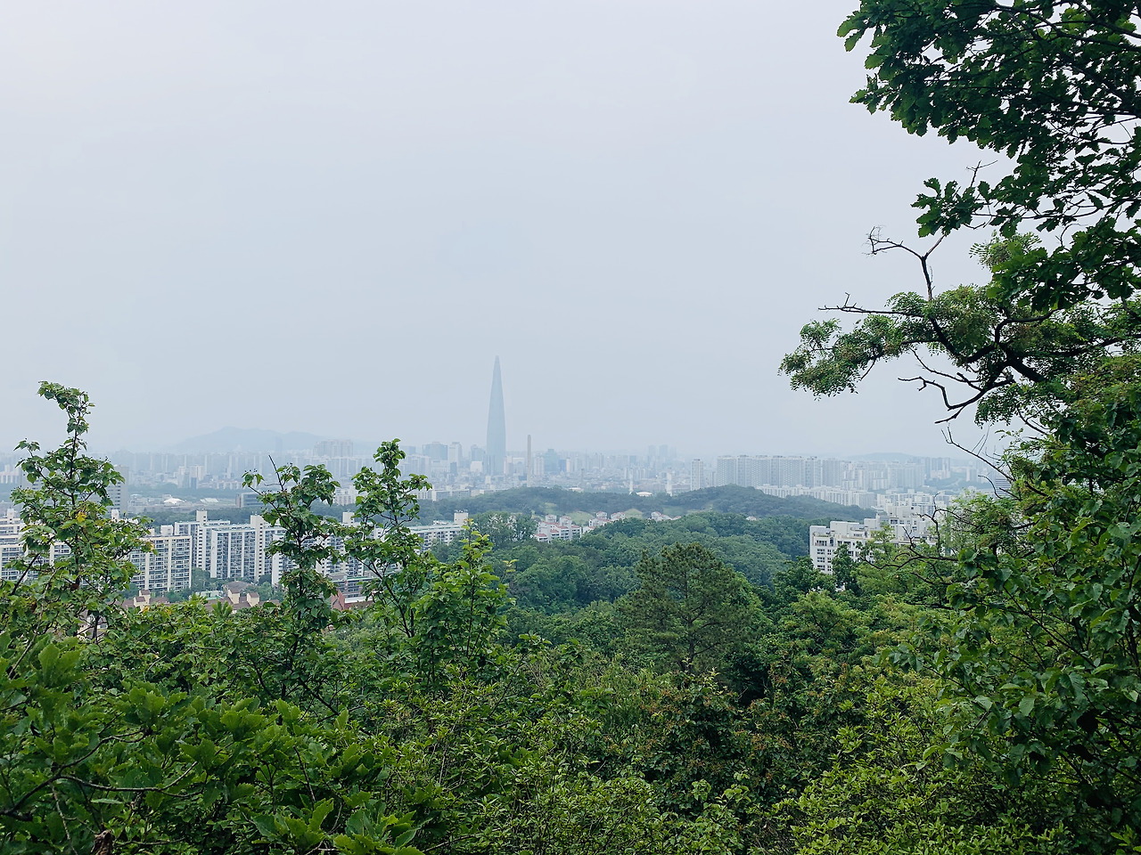 하지만 숲길 사진은 남은 게 없다. 평지에서 찍은 사진이 대부분이다. 오르막이 시작된 뒤에는 그저 좀비처럼 걷느라 사진 찍을 여유도 없었던 모양. 그나마 전망대에서 찍은 사진이 한 장 있다. 저 멀리 롯데월드타워가 보인다. 넋 놓고 걷고 걷다 보니 요란한 자동차 소리가 들리기 시작했다. 문명에 가까워진 것이었다. 자동차 소음이 그렇게 반가울 줄이야. 집에 어떻게 돌아갔는지도 잘 기억이 나지 않는다. 좀비처럼 전철을 타고 돌아왔다