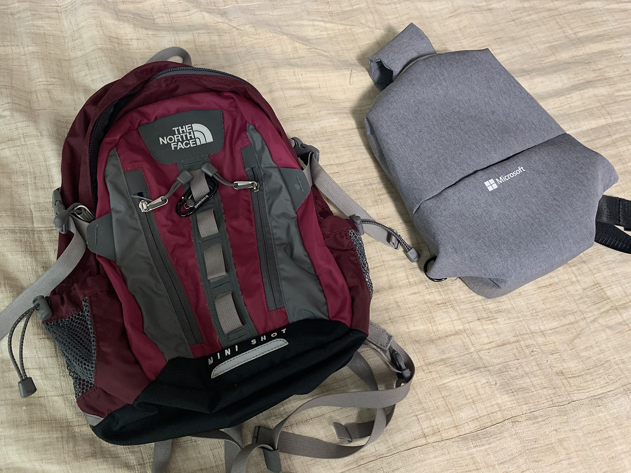 그런 의미에서 드디어 배낭가방을 들었다. 그동안은 대중교통 타면서 등산가방 메는 거 좀 쑥스러워서 무난한 슬링백(사진 우측) 매고 다녔다. 하지만 이제 가오 따질 때가 아니었다. 다녀보니 산길 중턱에서 비가 올 수도 있었고, 여기저기 걸려서 옷이나 가방이 찢어질 수도 있었다. 먼지 등으로 오염도 발생하고. 게다가 슬링백은 준비물이 점점 늘어나면서 작게 느껴지던 중이었다. 산길 구간이 포함된 둘레길에는 겸허하게 출발하기로 했다.