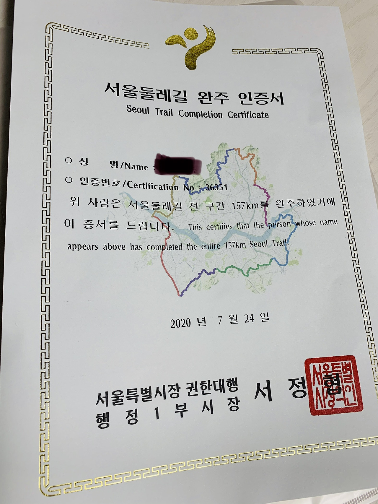 A. 인증서에도 우여곡절이 있다. 마지막 스탬프를 못 찍고 지나친 바람에 그 먼길을 며칠 후 다시 가서 스탬프도 찍고 인증서를 받으러 지원센터에 갔다. 그런데 인증서 발행이 바로 안 된다는 것이었다. 서울시장 유고 때문에 서식을 다시 만드는 중이라고 했다. 주소 적고 집에 가서 기다리면 일이 주 내로 우편으로 보내준다고 했다.