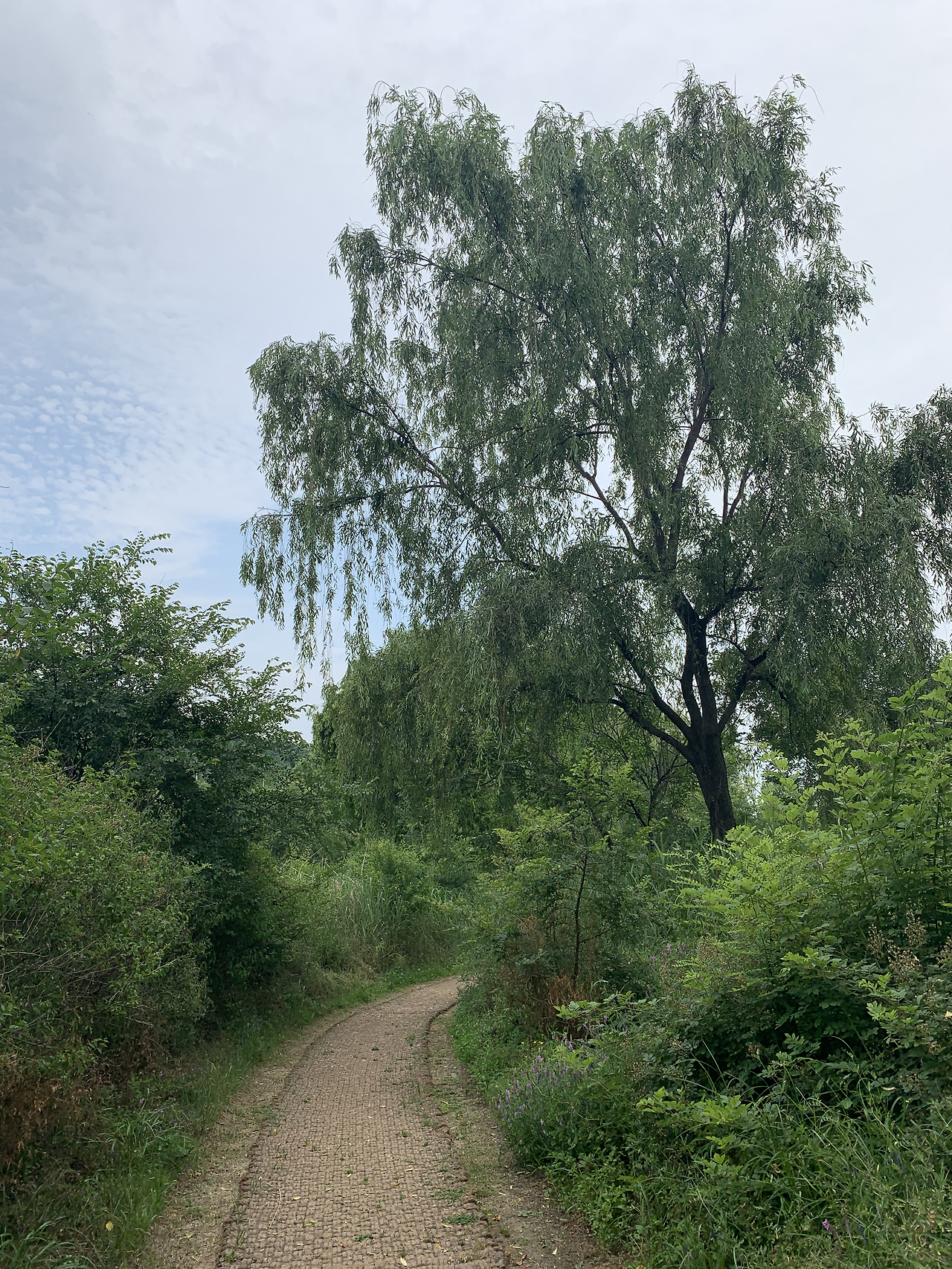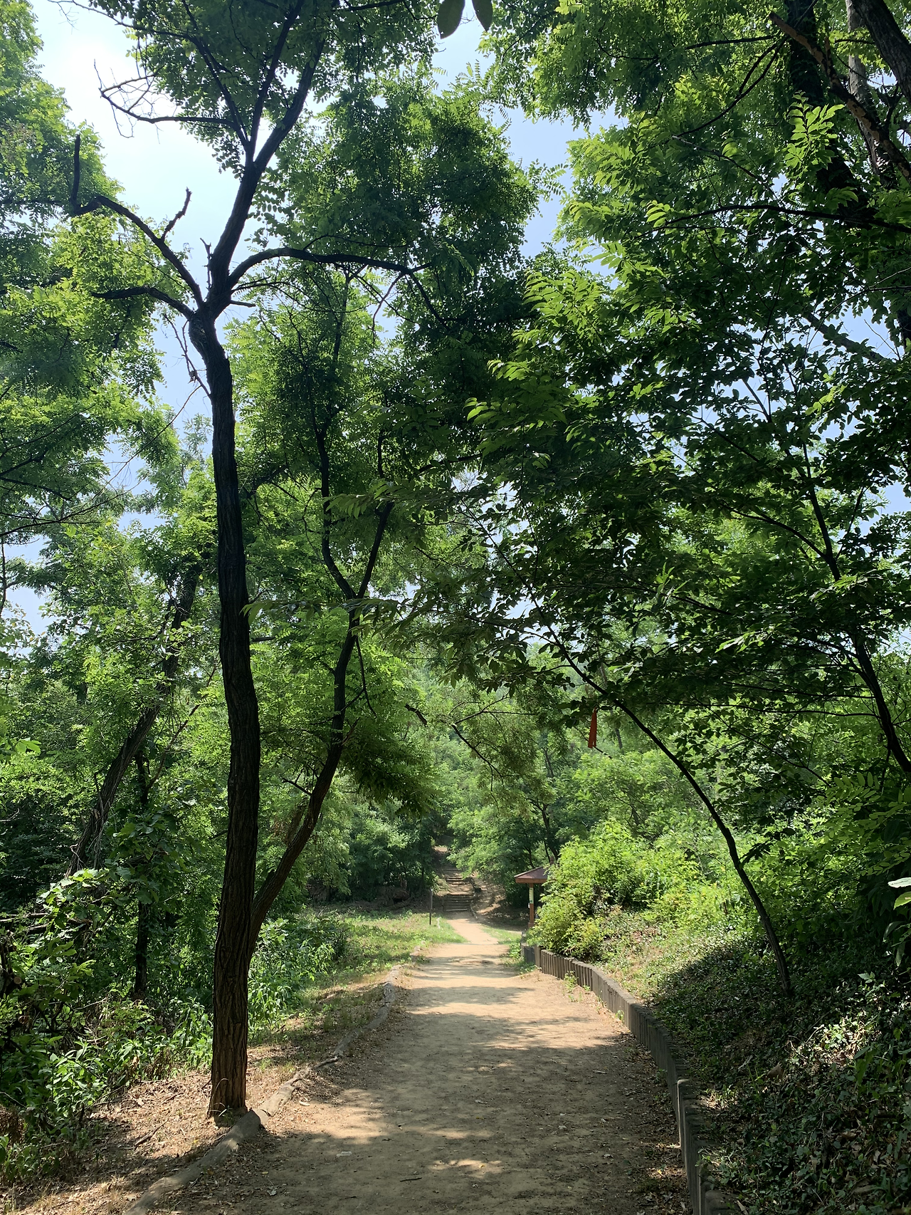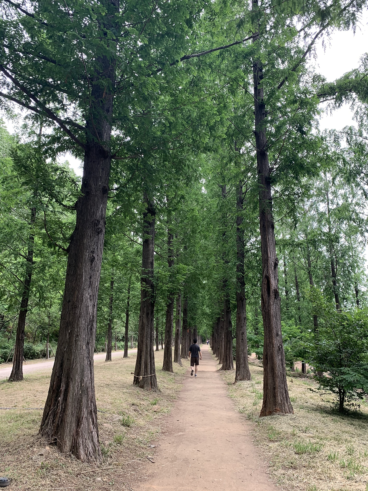 나무도 시원시원하게 뻗어있고, 길도 시원시원하고, 사람이 없어서 더욱 좋았던 길. 공간이 직선으로 깔끔하게 분할되어 있는 광경을 보면 기분이 좋아진다. 단아해. 차분해. 마침 사람도 길쭉하게 지나가길래 한 장 찍었다.