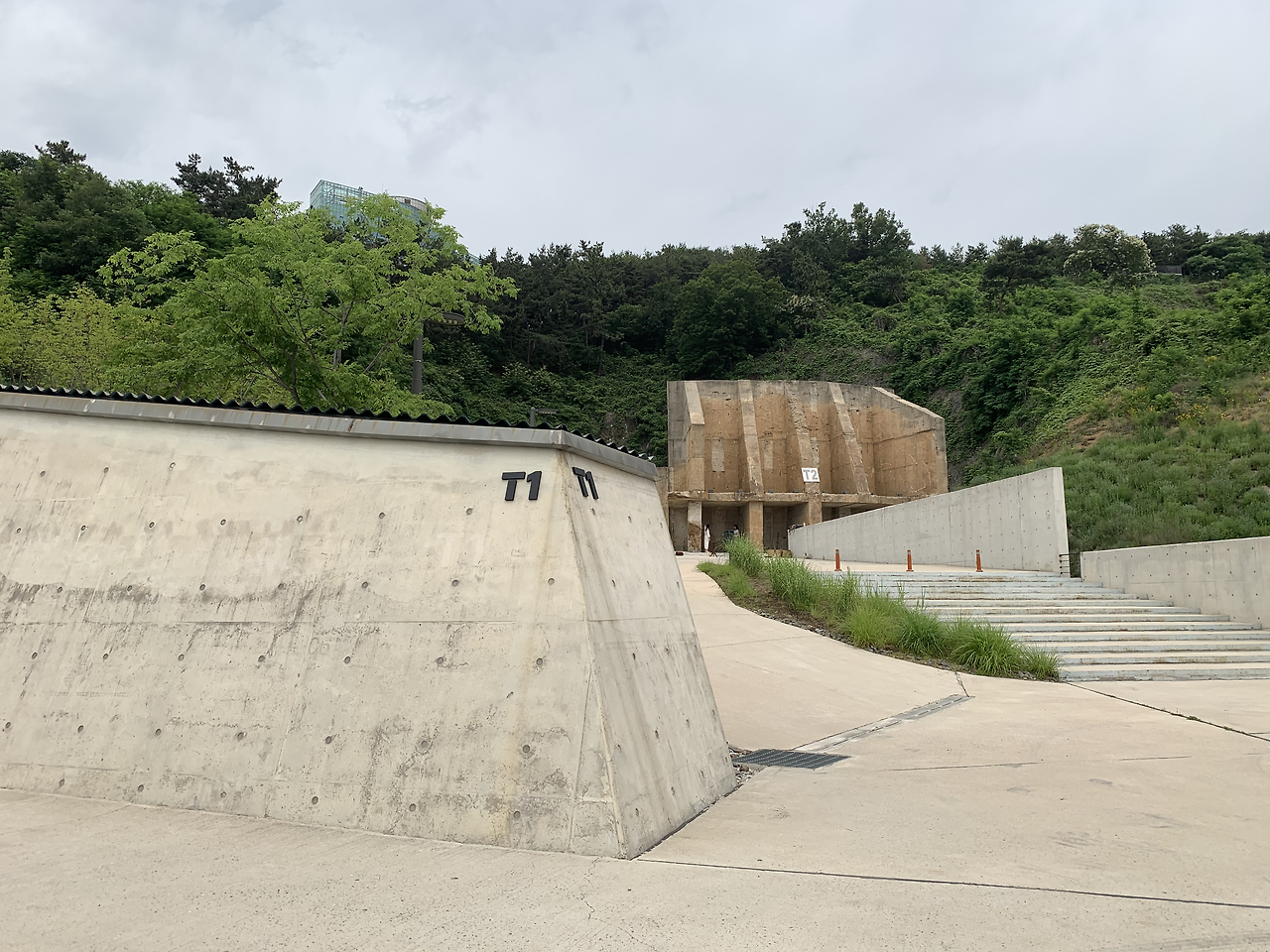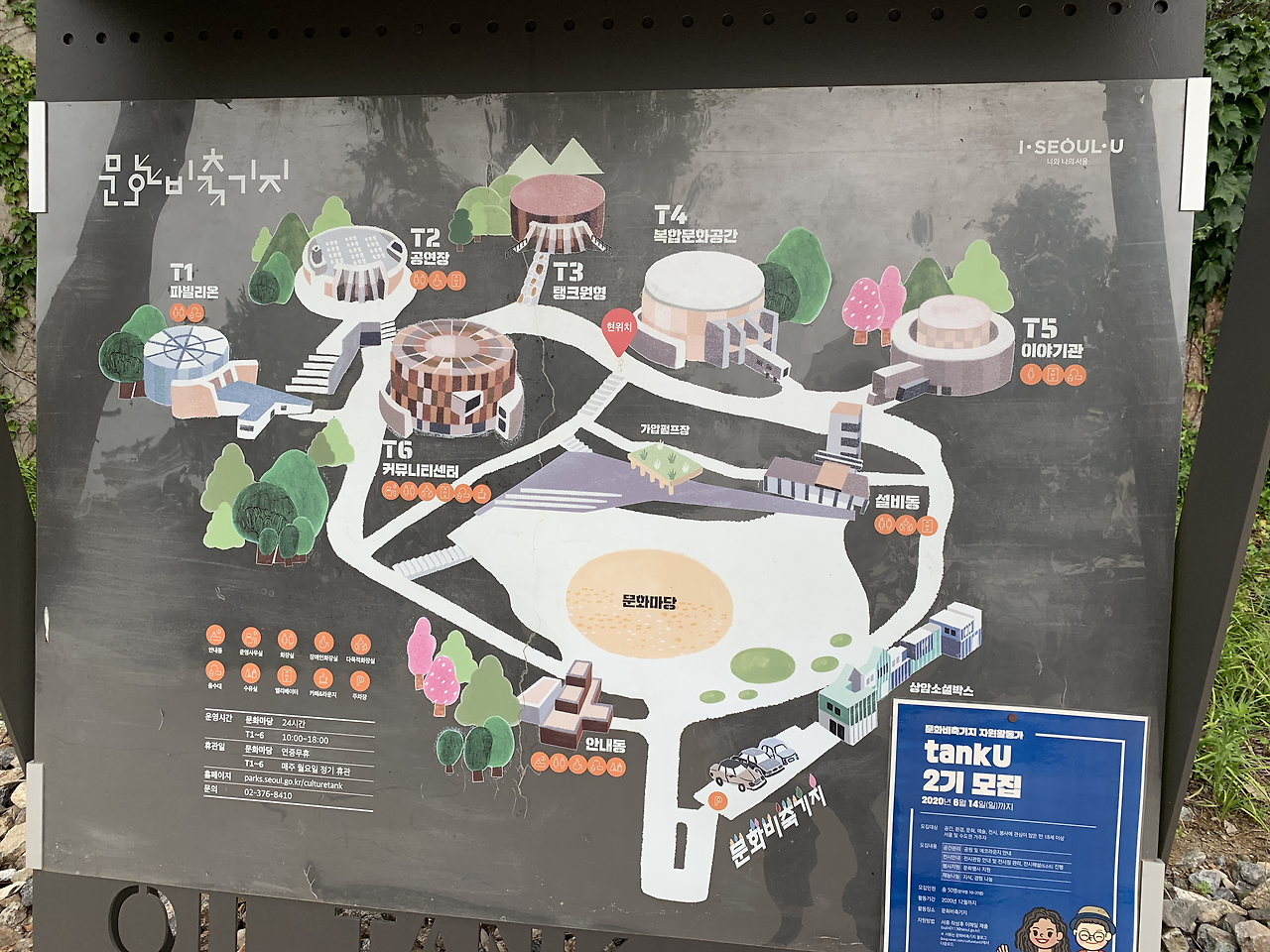 시계방향으로 T1, T2, T3, T4, T5라는 이름을 단 건물들이 늘어서 있다. 석유비축기지 시절의 건물들이 그대로 남아있는 곳들은 말끔하게 정비된 주변 환경과 비교되며 더욱 기묘한 느낌을 준다. 멸망한 제국의 역사유적지를 보는 것 같은 같은 감정을 불러일으킨달까? 주차장이 넉넉한 것 같지 않고, 주변에 다른 편의시설이 많지 않아 접근성면에서 어떨지 모르겠다. 주변 산책하는 겸 들르기엔 좋지만, 젊은 친구들이나 창작자들이 수시로 드나들면서 뭔가를 도모하기엔 아직 애매해 보이는 면이 있다. 물론, 코로나 시즌에 얼핏 봐서 드는 생각일지 모른다. 그런 의미에서 다음에 또 와봐야지 다짐했다.