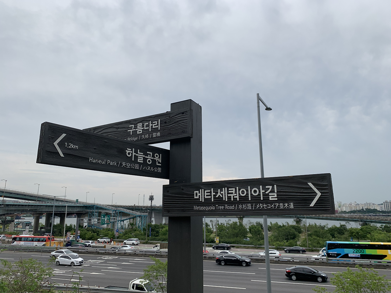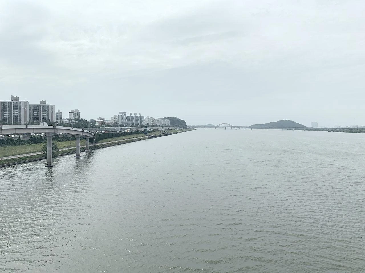 가양역 3번 출구로 나가면 가양대교 초입에서 스탬프를 찍을 수 있다. 스탬프를 찍으면 바로 가양대교를 건너러 가게 된다. 가양대교가 뷰는 좋은데 도보길이 너무 좁다. 자전거를 끌고 가라고 되어 있지만, 자전거를 탄 채 쌩쌩 달리는 사람들이 많다. 선수급 차림의 자전거 라이더들을 피하느라 맘 편히 못 걷는 길. 차량도 쌩쌩 달리니 길을 충분히 즐기기는 쉽지 않다.