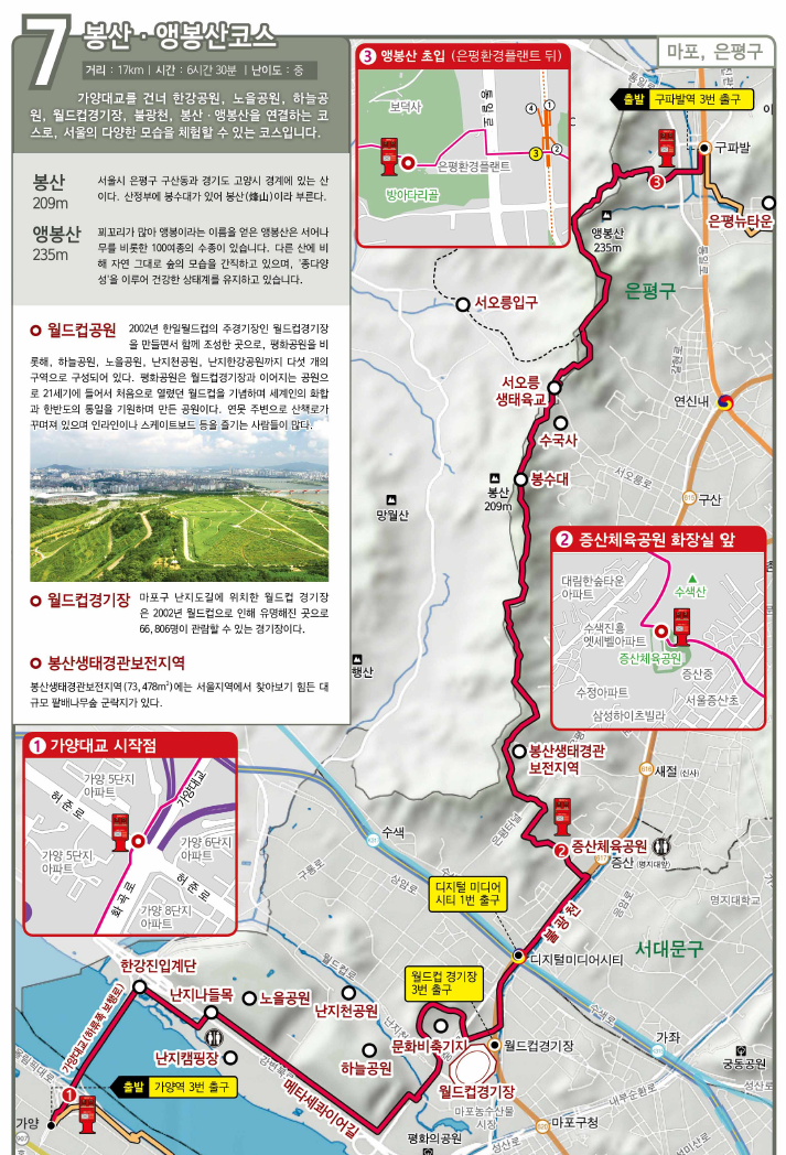 서울 둘레길 7코스는 봉산, 앵봉산 코스로 2개의 세부코스로 나눠져 있다. 가양역에서 출발, 구파발역에서 끝난다. 2코스에 난이도가 좀 있다 해서 두 번에 나눠 걸였다. 7-1코스는 그냥 산책길로 좋은 길, 7-2는 사실상 등산에 가까워서 두 코스의 난이도 차가 크다. 두 코스 모두 다양한 꽃과 풀, 수종을 볼 수 있는 생태학습용 코스다.