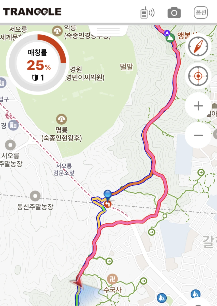 그리고 참고로, 둘레길 코스가 일부 수정된 것 같다. 앵봉산 내려오는 길에 내가 쓰던 GPS앱의 코스북이 코스 이탈 안내음을 울린다. 둘레길 표시대로 가고 있는데 이탈하고 있다고 해서 나중에 루트를 보니 이유는 모르겠으나 경로가 갈라졌다가 다시 만난다. 어느 길로 가건 결국 만나게 되니까 별 문제는 아니지만, 공사 등이 있을 수 있으니 둘레길 표지 위주로 따라가자.