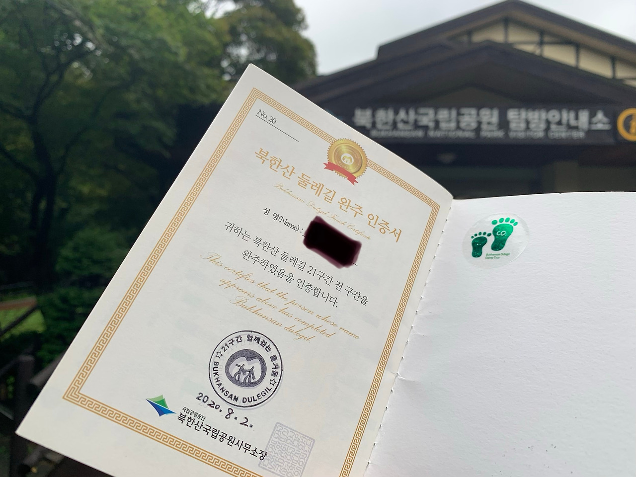 북한산 둘레길 완주 인증서는 따로 발행되지는 않는다. 스탬프북 맨 뒷장에 있고 발행 넘버로 따로 관리되지 않는다. 서울 둘레길은 발행 넘버와 별도의 인증서가 있다. 하지만... 배지가 못생겼다. 정말 못생겼다. 북한산 둘레길은 스탬프 선도 가늘고 예쁘더니 배지도 예쁘다. 디자인하신 분 복 받으시라.