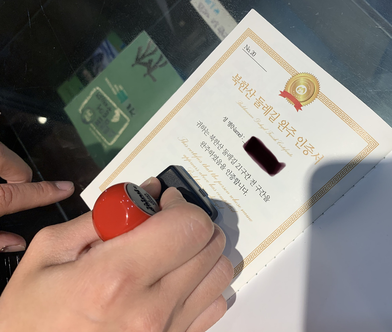 아래 사진은 인증 스탬프를 찍어주시는 북한산 국립공원 탐방안내소의 다정한 직원 분의 고운 손이다.