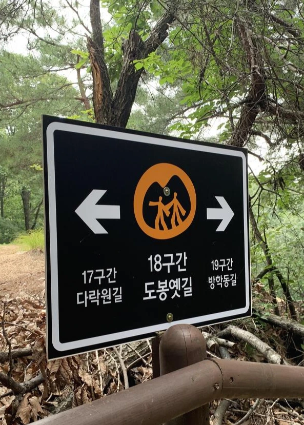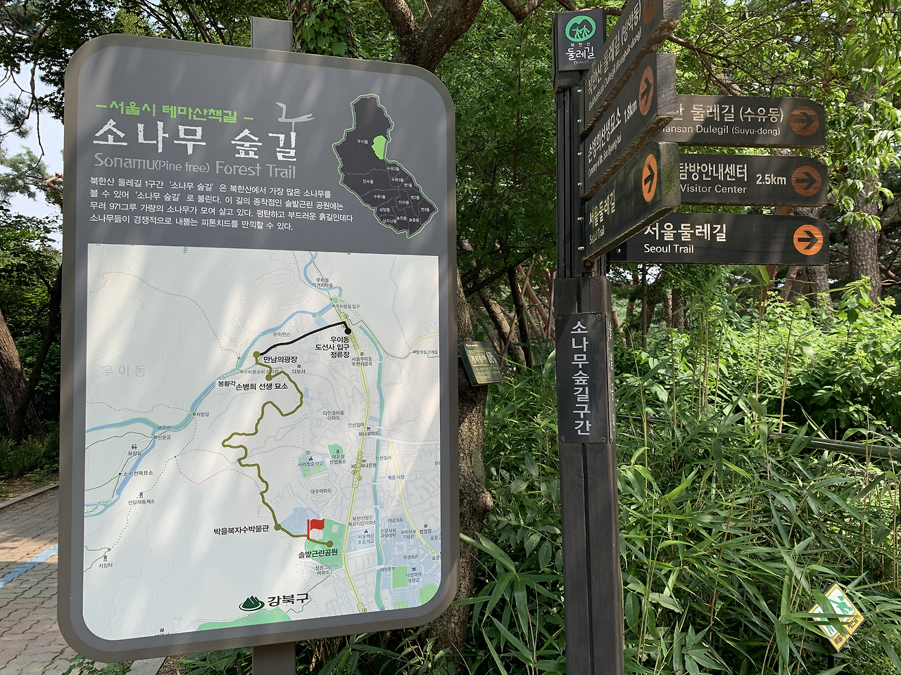 거리표 외에도 길안내 표지판은 상당히 많은 편이지만, 초반에는 헷갈리기가 쉽다. 구간 번호가 병기된 경우에는 덜 헷갈리는데 길 이름만 쓰여 있으면 방향이 감이 잡히지 않는다. 그리고 자신이 걷고 있는 길 이름을 제대로 기억하는 것도 벅찬 일이다. 위 사진처럼 왕실 묘역 길, 방학동길, 소나무숲길, 우이령길이 줄줄이 쓰여 있으면 방학동길을 다 걸은 시점에서 어느 방향으로 가야 하는지 좀처럼 감이 잡히질 않는다. 내 경우엔 그날 걸을 길 이름을 작은 지도에 미리 체크해서 수시로 확인했다. 솔직한 심정으로는 그냥 5구간, 6구간 등 직관적인 이름을 모두 병기해주는 게 좋을 것 같았다.
