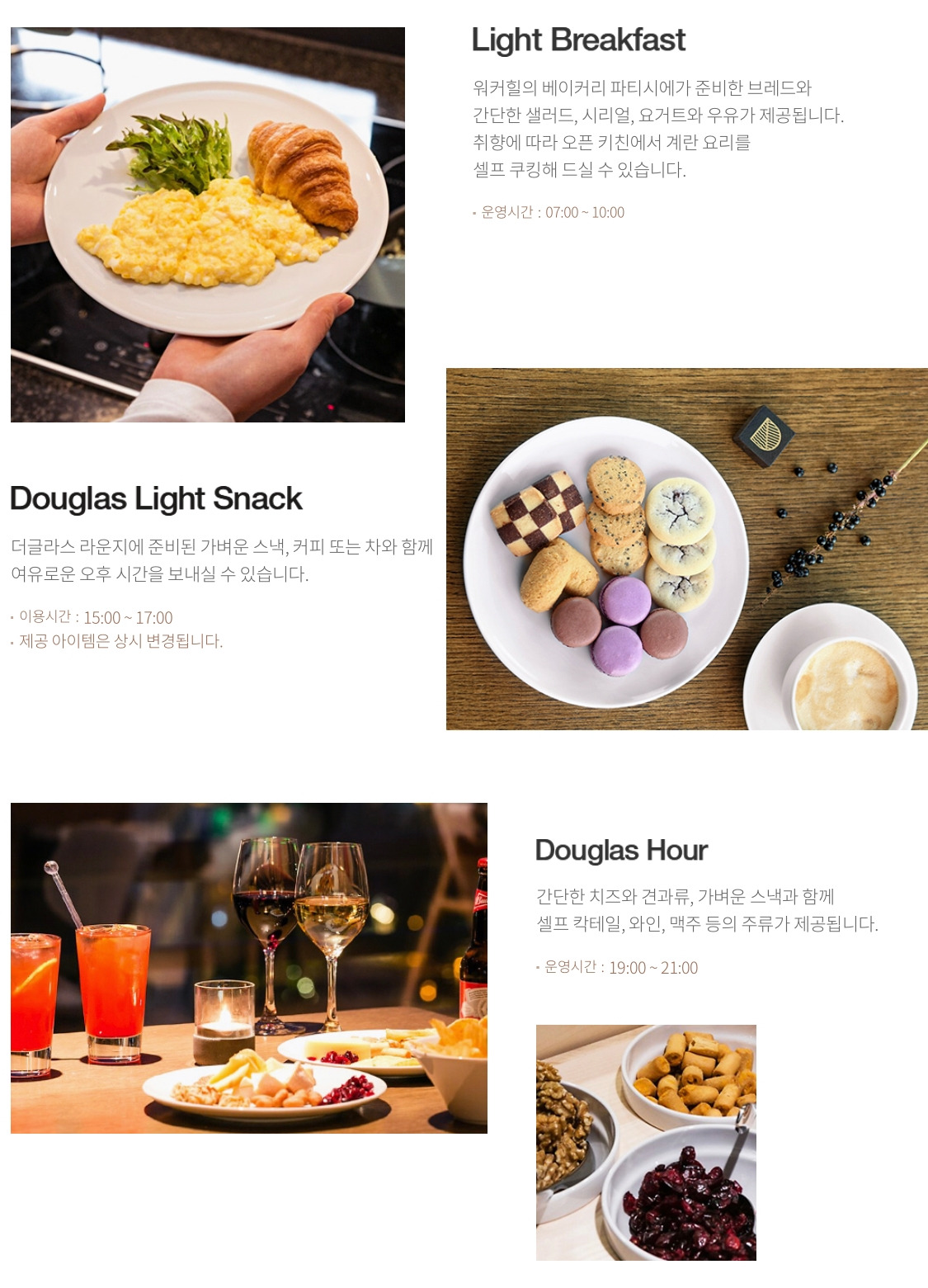 더글라스 라운지의 조식은 정말 간단한 아침식사 정도, 간식은 쿠키 몇 개와 커피를 계속 마실 수 있는 여유로움 그리고 더글라스 아우어는 호텔의 해피아워라는 개념의 무제한 주류와 간단한 스낵류