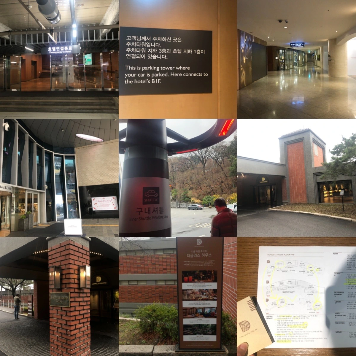 워커힐 호텔에 도착하면 발렛을 맡기면 (1회 무료) 바로 셔틀을 불러주고 그 셔틀을 이용해 더글라스 하우스에 도착 차로 3분이내 거리였다. 도보로는 15분 이내로 걸을만한 거리였다. 우리는 주차타워 지하3층에 주차를 하고, 거기는 바로 본관이랑 연결 되어 있어서 올라가서 호텔 내부를 조금 둘러보고 와인샵도 들러서 구경도 하다가, 셔틀을 불러서 체크인을 하였다. 체크인 할 때, 더글라스 하우스 내부 약도와 세부내용도 하나하나 설명해 주었으며, 실내웨어도 있어서 대여도 해준다. 이제. 객실키를 받고, 객실로 향하였다.