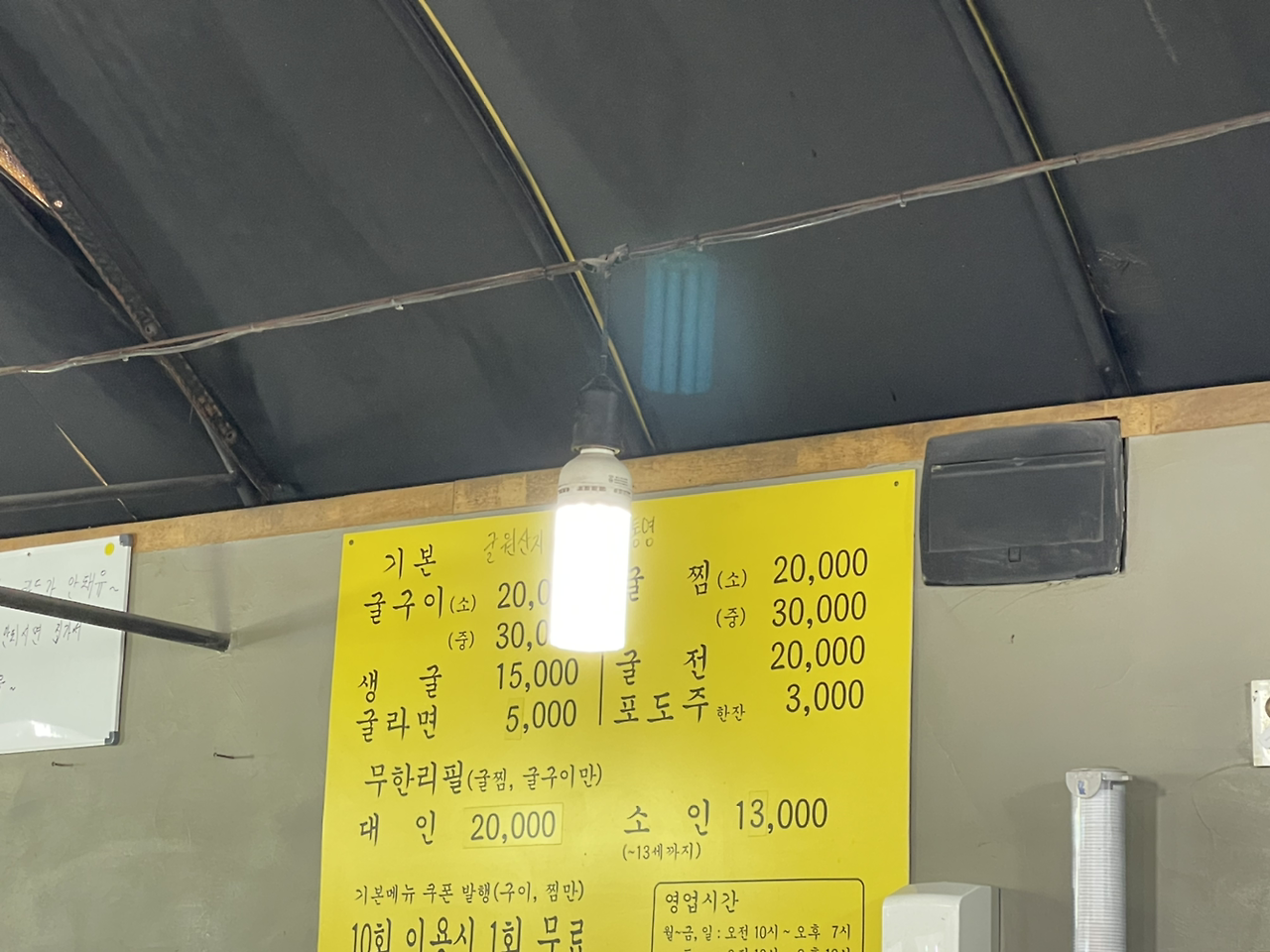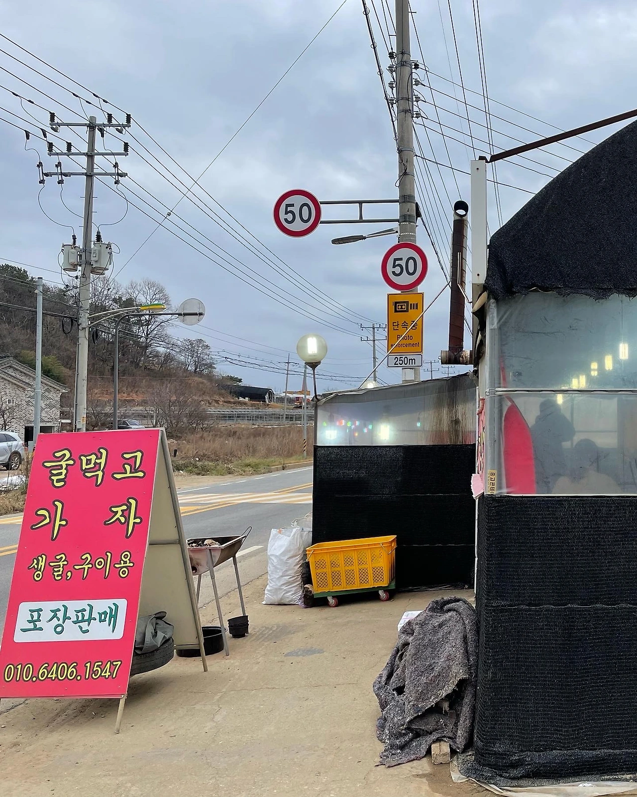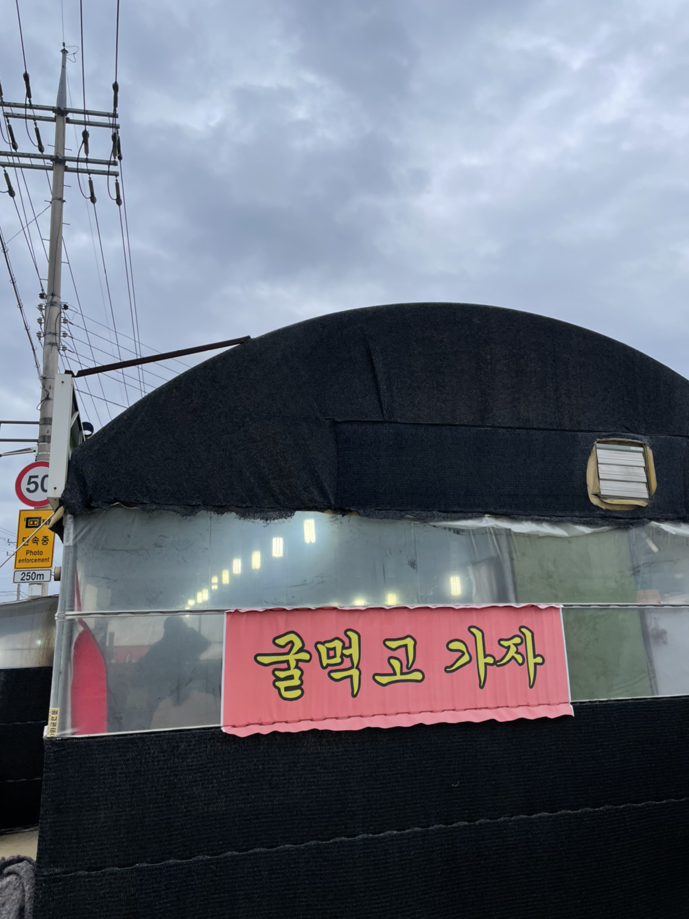 #굴 먹고 가자 정말 식당 이름도 딱 와닿는 단어였다. 조금 엉뚱한 곳에 비닐하우스를 약간 개조해서 만든 어설퍼 보이는 식당이지만, 속은 꽉 찬 느낌의 굴구이 집이었다. 화물트럭이 지나가면 그 울림까지 느껴질 정도로 약간 불안한 곳이지만, 그 나름의 운치가 있었다.