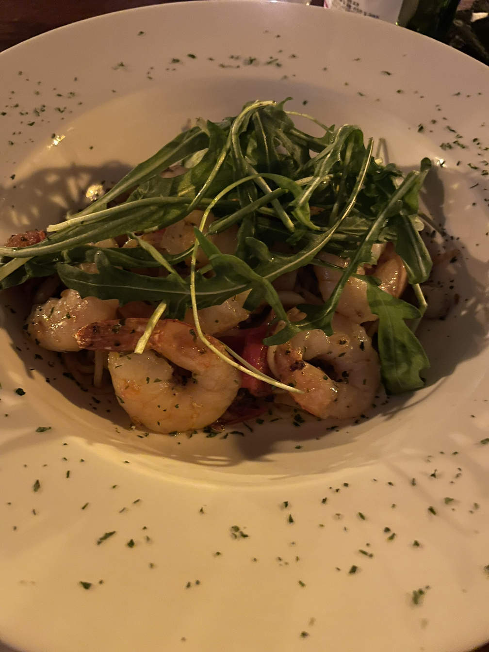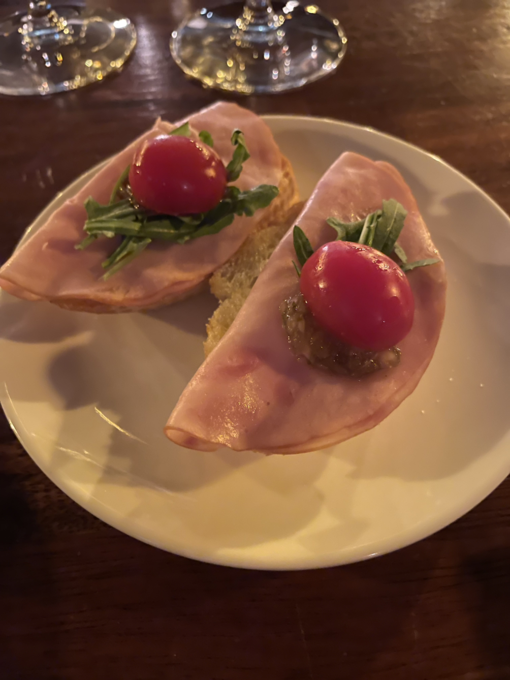 자리에 앉자 간단한 "브루스케타"와 비슷한 스낵이 테이블에 놓였다. 저녁을 먹지 않고 가서, 배가 살짝 고팠는데, 한 입에 배어 무니, 신선한 루꼴라와 토마토의 향이 식욕을 돋운다.